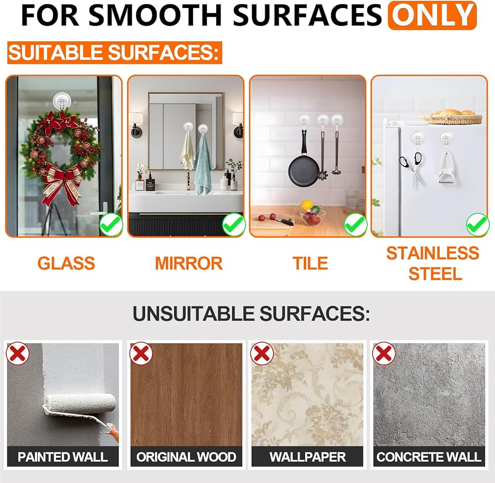 استخدامات متعددة: تلتصق خطافات الشفط القوية هذه بأمان بالبلاط والزجاج والمرايا والمعادن والأسطح الملساء الأخرى. مثالي للحمامات والمطابخ وغرف النوم والمركبات الترفيهية والمساكن والمكاتب والمزيد. إنها رائعة للحفاظ على المساحات منظمة ومثالية أيضًا لتعليق أكاليل الزهور والأضواء الخيطية أثناء العطلات مثل عيد الميلاد