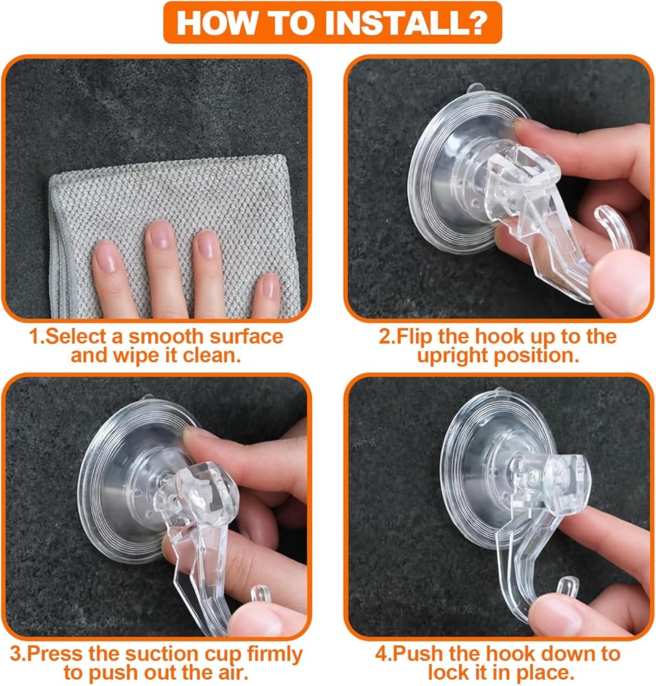 TOOL-FREE INSTALLATION: No tools or drilling required—just a few quick steps. Clean the smooth surface, lift the hook to the upright position, press the suction cup firmly to expel air, then push the hook down to lock. Fast and hassle-free setup in seconds. For installation or usage guidance, please refer to the installation video or reach out for assistance.