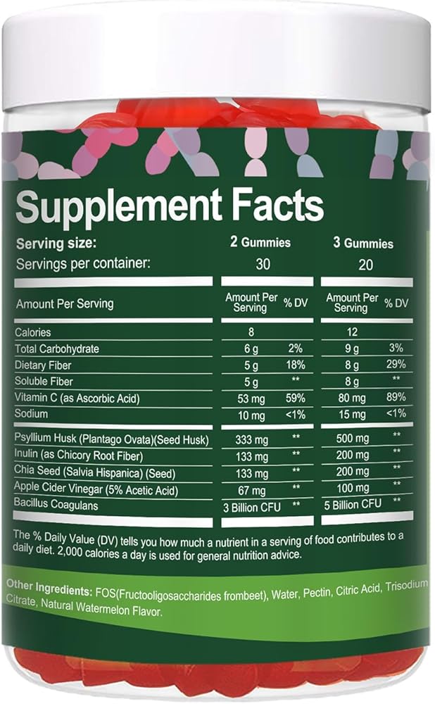 NATURAL PREBIOTIC FIBER & SUPERFOOD BLEND: We've carefully selected natural ingredients to provide a comprehensive fiber supplement. With 500 mg of Psyllium Husk, known for its prebiotic effects, and 200 mg of Inulin, our gummies support the growth of beneficial gut bacteria. Additionally, the inclusion of 200 mg of Chia Seeds and 100 mg of Apple Cider Vinegar adds a superfood blend that is rich in nutrients and known for their health benefits, such as providing a feeling of fullness.