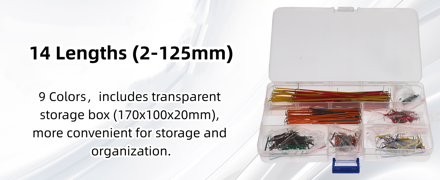 ⭐️Portable Boxed Jumper Wires: The 350pcs jumper wires come in 14 different values, each values with 25pcs. These jumper wires are placed in transparent plastic boxes that are easy to identify, while the accompanying tweezers help safely handle various small parts. Very suitable for electronic enthusiasts who want to learn anytime, anywhere and keep their laboratory desktop clean.