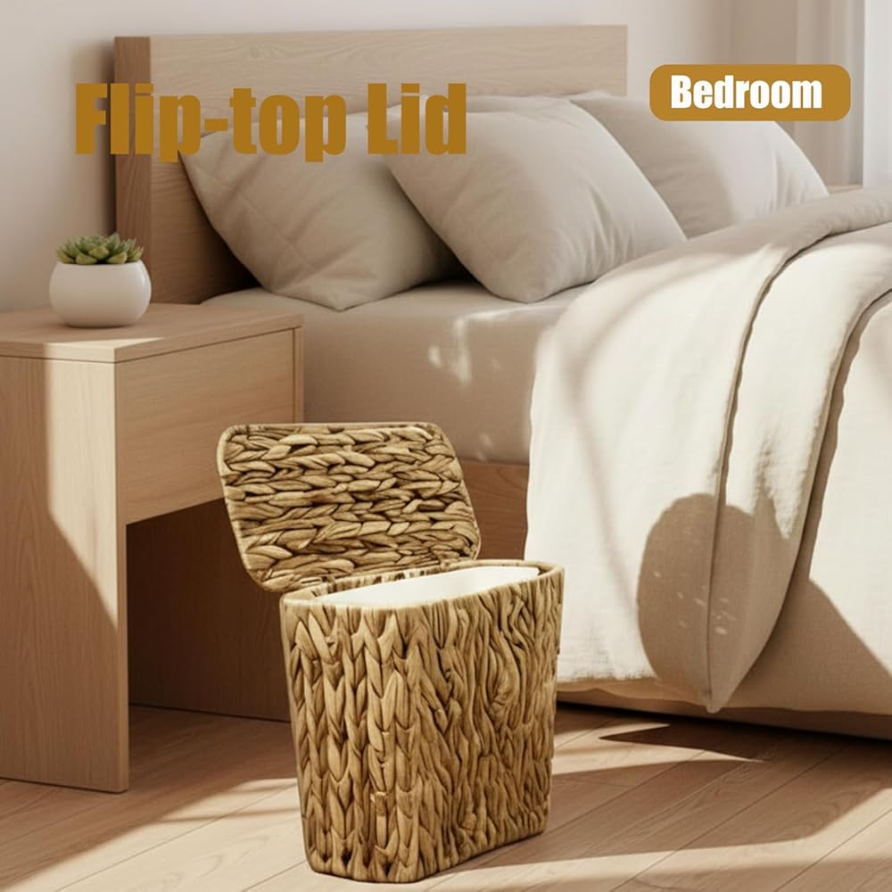 Yatmung Wicker Trash Can Small Bathroom Trash Can with Lid - Boho Waste Basket for Bedroom, Living Room, Office - Natural Water Hyacinth - Narrow Garbage Can with Removable Liner