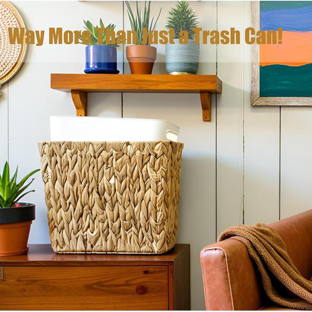 Boho-Chic That Actually Works as a Trash Can. Our wicker beauty blends so seamlessly with your decor, guests might mistake it for that cute basket you scored at a boutique. Handwoven from natural hyacinth and reinforced with a sturdy frame, it's the perfect mix of boho charm and everyday function. Tuck it between your toilet and sink, style it in your living room, or let it add warmth to your bedroom—it fits anywhere a little trash (or a lot of style) needs to go.
