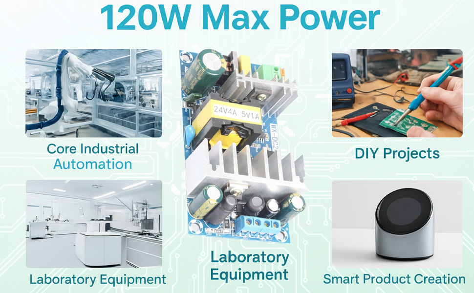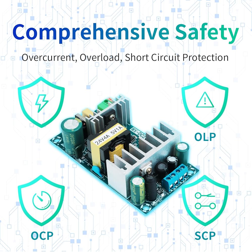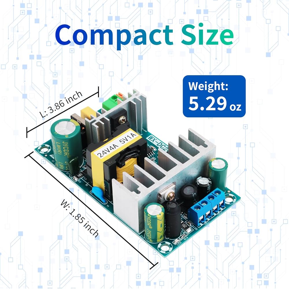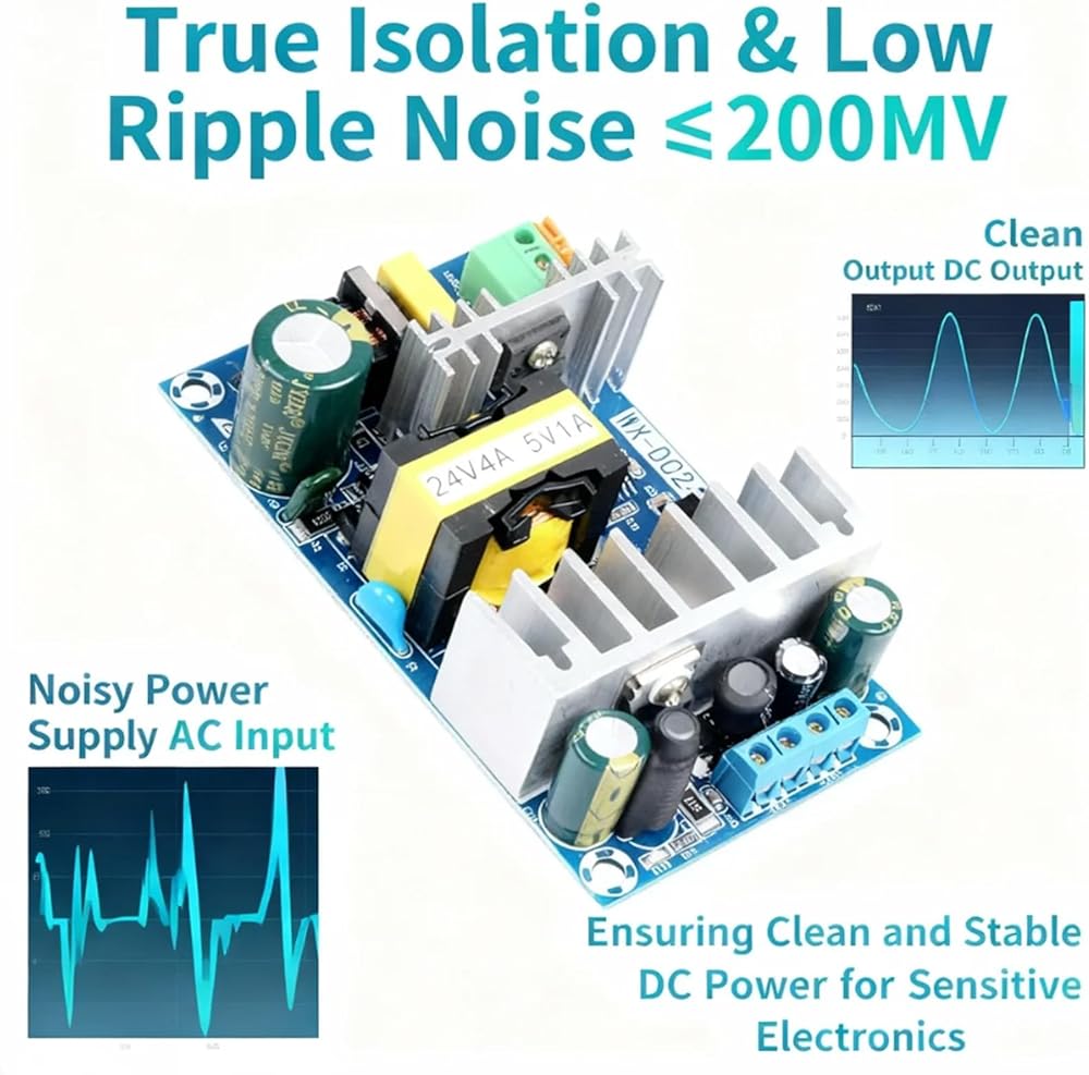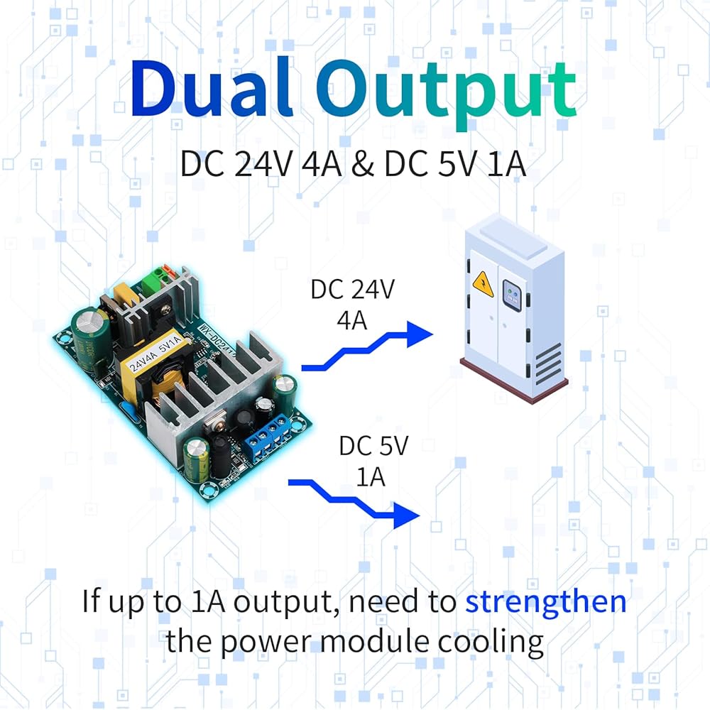 Professional Dual Output Design (24V & 5V): Delivers a stable 24V 4A (96W) and 5V 1A simultaneously, perfect for complex industrial control systems, DIY projects, and embedded applications requiring two different voltage levels.