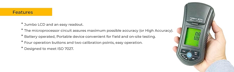 Supply Scope: 1 Unit of TU-2016 Portable turbidity meter with an Instruction Manual and a Factory Calibrated Certificate | Applications: Test municipal water, Drinking water, Swimming water, Wastewater treatment, Industrial processes, Environmental Monitoring, Research on aquatic ecosystems, Food purposes, Beverage Industries.