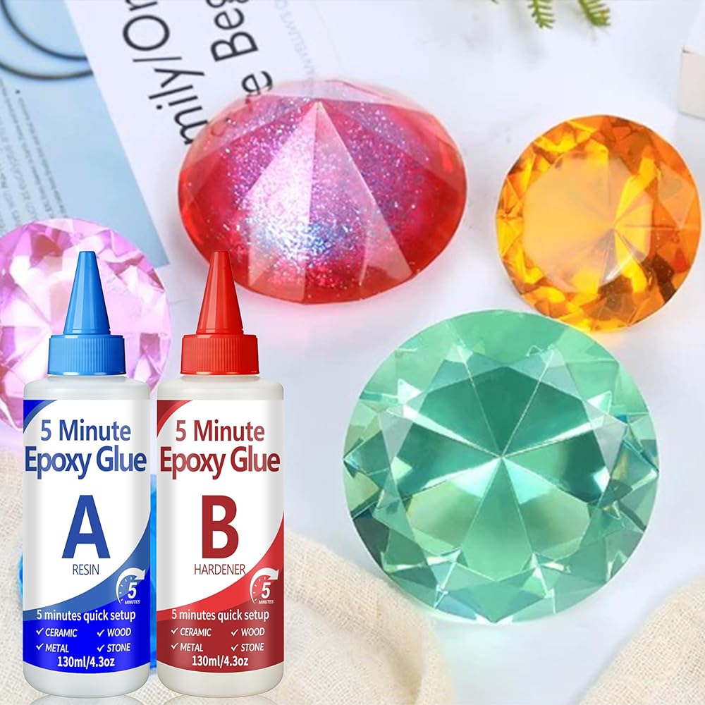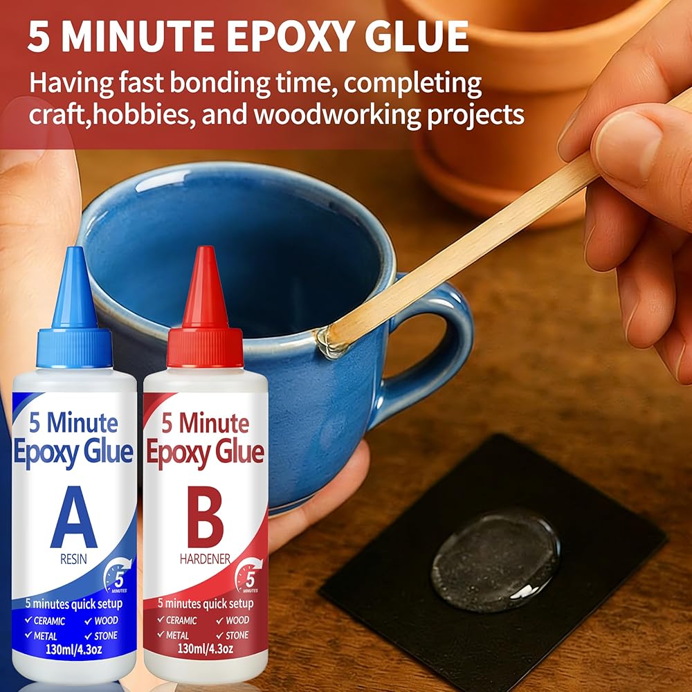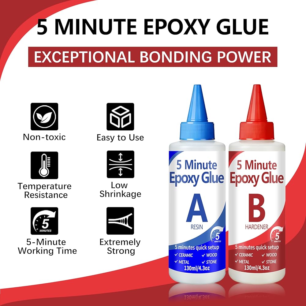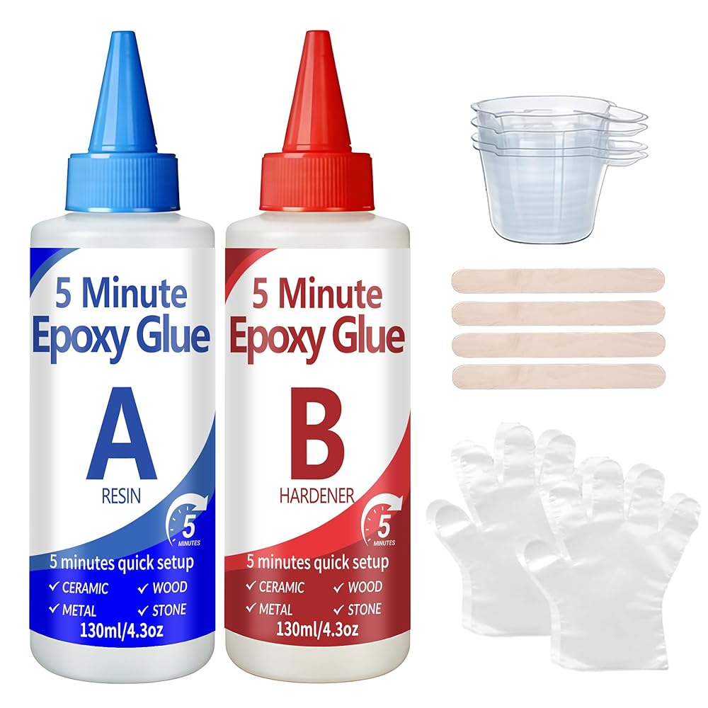 5 Minute Epoxy Kit: Our two part epoxy glue bottle caps have different colors. The set contains 2 bottles of AB clear epoxy glue (net 250 ml), a small wooden stick, gloves and mixing bowls. epoxy glue fully cured to get a strong, long lasting, waterproof repair