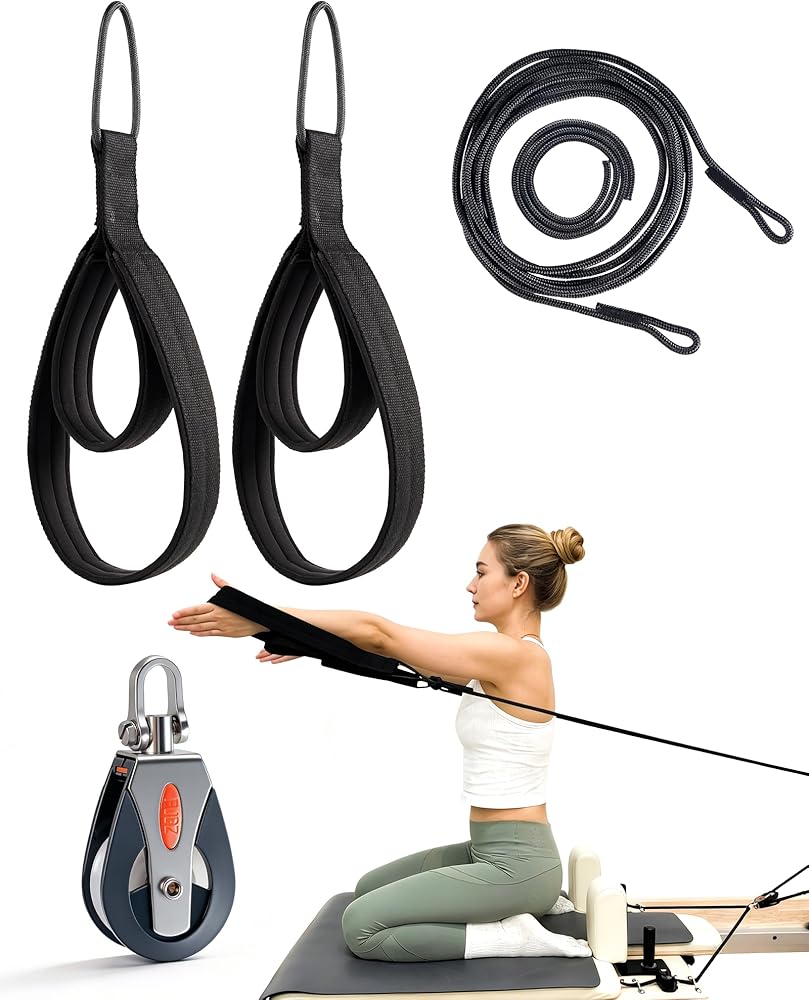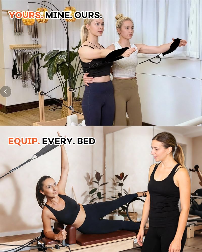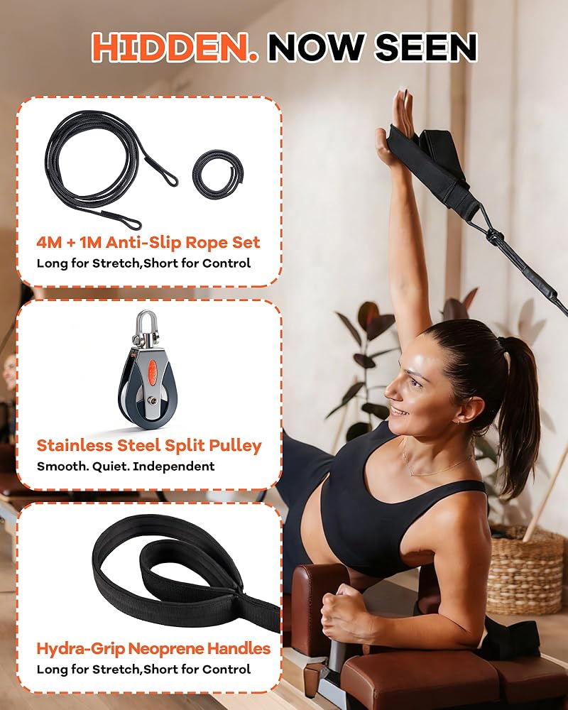【Unlock Professional-Grade Split-Size Training】Transform your standard reformer with this complete split rope system. The central rope divider enables each arm to move independently, unlocking split-arm exercises, unilateral training, and alternating movements. Perfect for correcting muscle imbalances, intensifying core engagement, and achieving advanced muscle control beyond basic connected ropes.