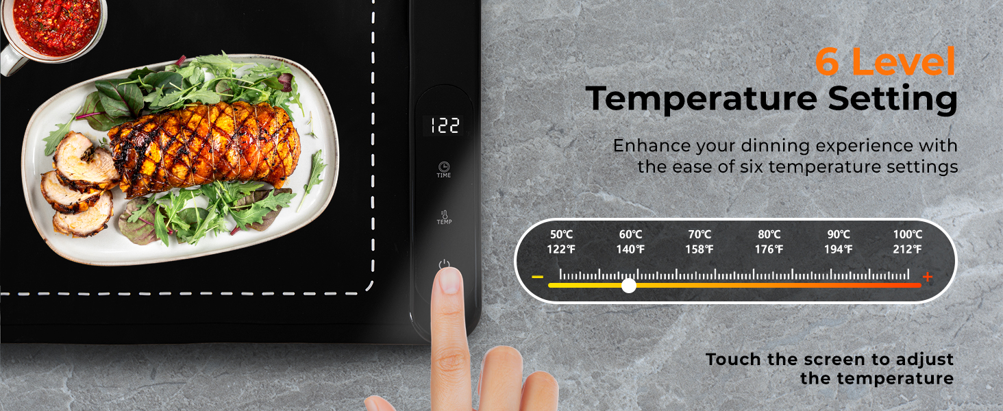 Adjustable Temperature & Timer Control: Customize your heating needs with 6 temperature levels (122°F–212°F) and 6 timer settings (1–6 hours). Whether you're keeping soup warm or maintaining dessert at the ideal temperature, this food heater tray gives you total control. The auto shut-off function adds an extra layer of safety for peace of mind