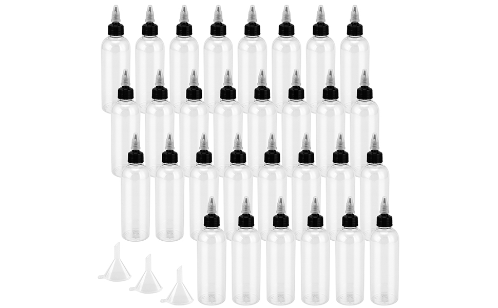 QUANTITY AND SIZE - You will receive 30pcs plastic bottles with twist top cap. The height of the squeeze bottle is 7.2 inches, and the diameter is 2 inches, the capacity is 8.5oz/250ml.