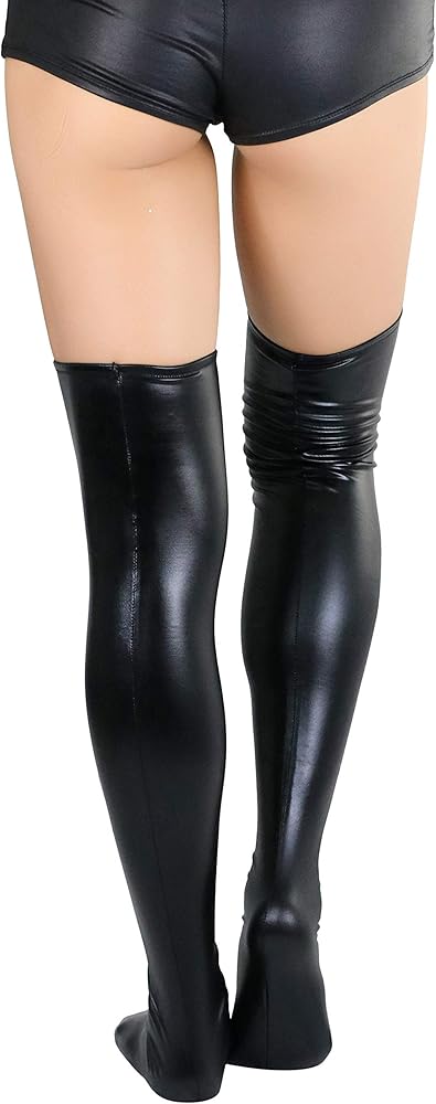 💕 Featuring: black thigh highs, footless, wet look, lace-up backseam, faux-leather front fabrication, stretch, comfortable, lace-up panel can be worn in the back or front