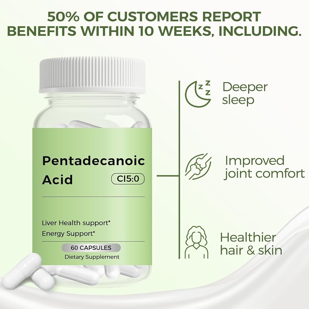 Pure Pentadecanoic Acid (C15:0) for Cellular Integrity: Our formula delivers highly concentrated, pure Pentadecanoic Acid (C15:0) — a science-validated nutrient critical to preserving cellular integrity. This high-potency C15:0 directly fortifies cell membranes, your body's primary line of defense, locking in structural strength, resilience, and full functionality to sustain optimal cellular health day in and day out.