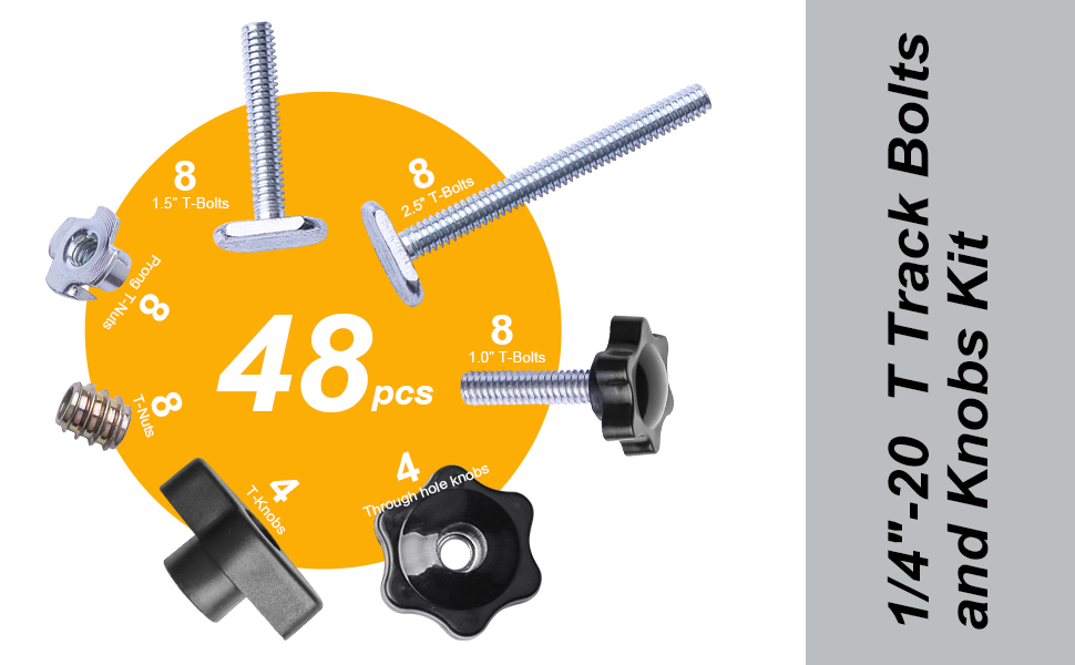 You will receive 2 different lengths of 1/4 "-20" T "track bolts (1-1/2" and 2-1/2 "in length), including 8 threaded star knobs, 4 bolt star knobs, 4 threaded wing knobs, 8 insert nuts, and 8 pointed nuts