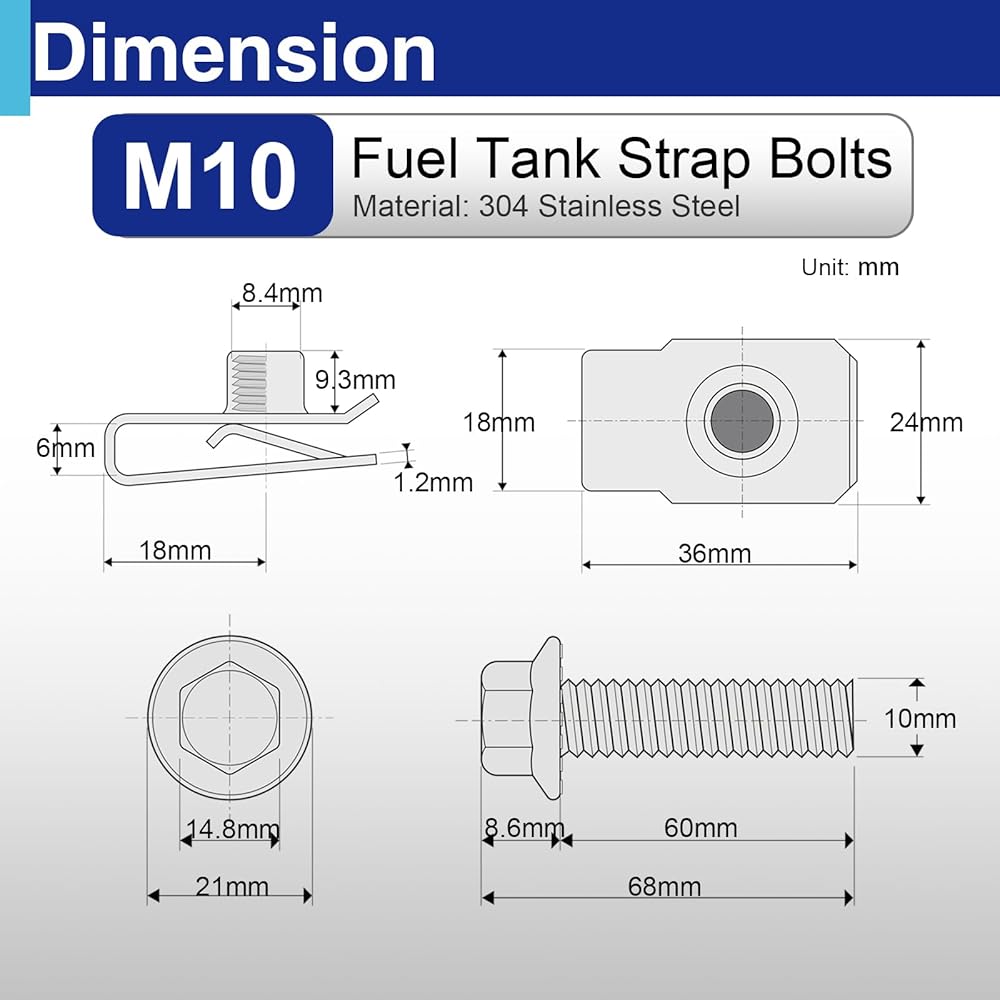 Material: Fuel Tank Strap Bolt Hardware Kit Is Made Of Premium Quality 304 Stainless Steel With High Strength, Reliable, Preventing Rust And Corrosion, Not Easy To Break Or Deform, Can Be Used For A Long Time. This Kit Is A Reliable Replacement For The Original Hardware That Is Missing Or Damaged, Or Has Failed.