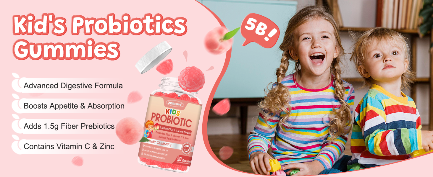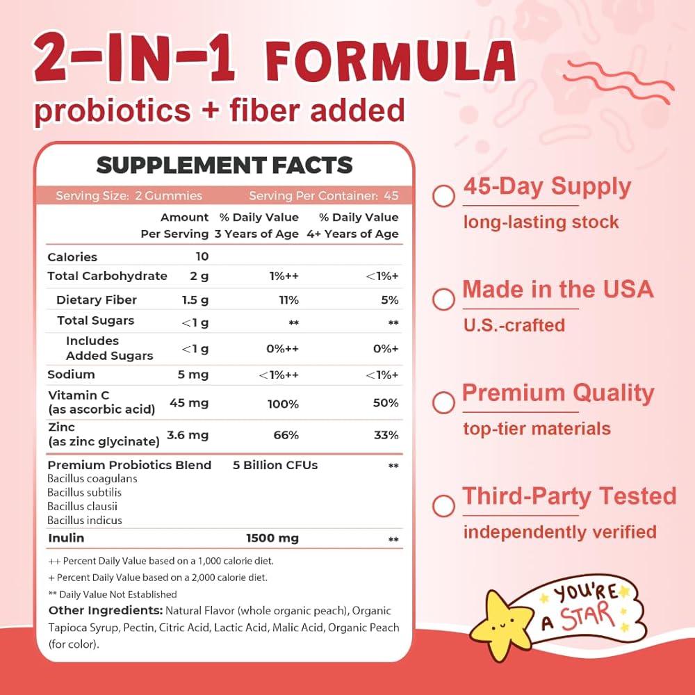 Maximize Health: Probiotics + Prebiotics: Our kids probiotics gummies feature 5 billion CFUs of 4 probiotic and high-level prebiotic fiber, achieving dual benefits to enhance gut and digestive health. Combined with vitamin C and zinc, they work together to boost nutrient absorption and immune support. Kids probiotic is formulated to support children's health at every stage, with a delicious peach flavor, offering an enjoyable way to provide health support for children over 3 years old!