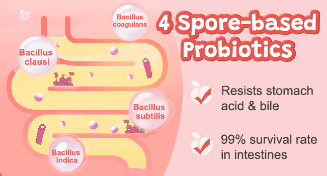 Multidirectional gut support: Kids probiotic feature 5 billion CFUs from 4 spore probiotics. Studies shown B.coagulans and B.subtilis can relieve diarrhea, bloating, and more; B.indica helps maintain gut acidity, and B.clausii inhibits harmful flora. Probiotics for kids use the acid resistance of spore probiotics enabling them to resist gastric acid erosion, ensuring they reach the intestines effectively, aiding in food decomposition and ensuring high bioavailability and nutrient absorption.
