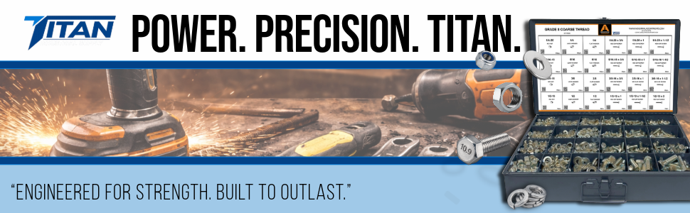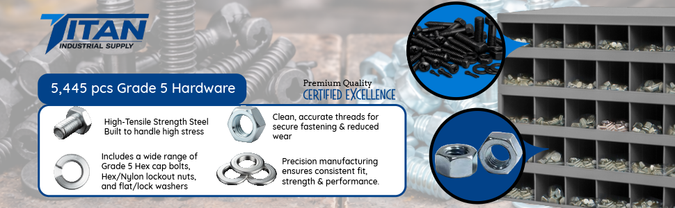 Titan Industrial Supply- 5,445 pcs Grade 5 Coarse Hardware Assortment Kit with Hex Cap Screws, Hex Nuts, Nylon Locknuts, Washers, & Two Durham 40 Hole Metal Bin