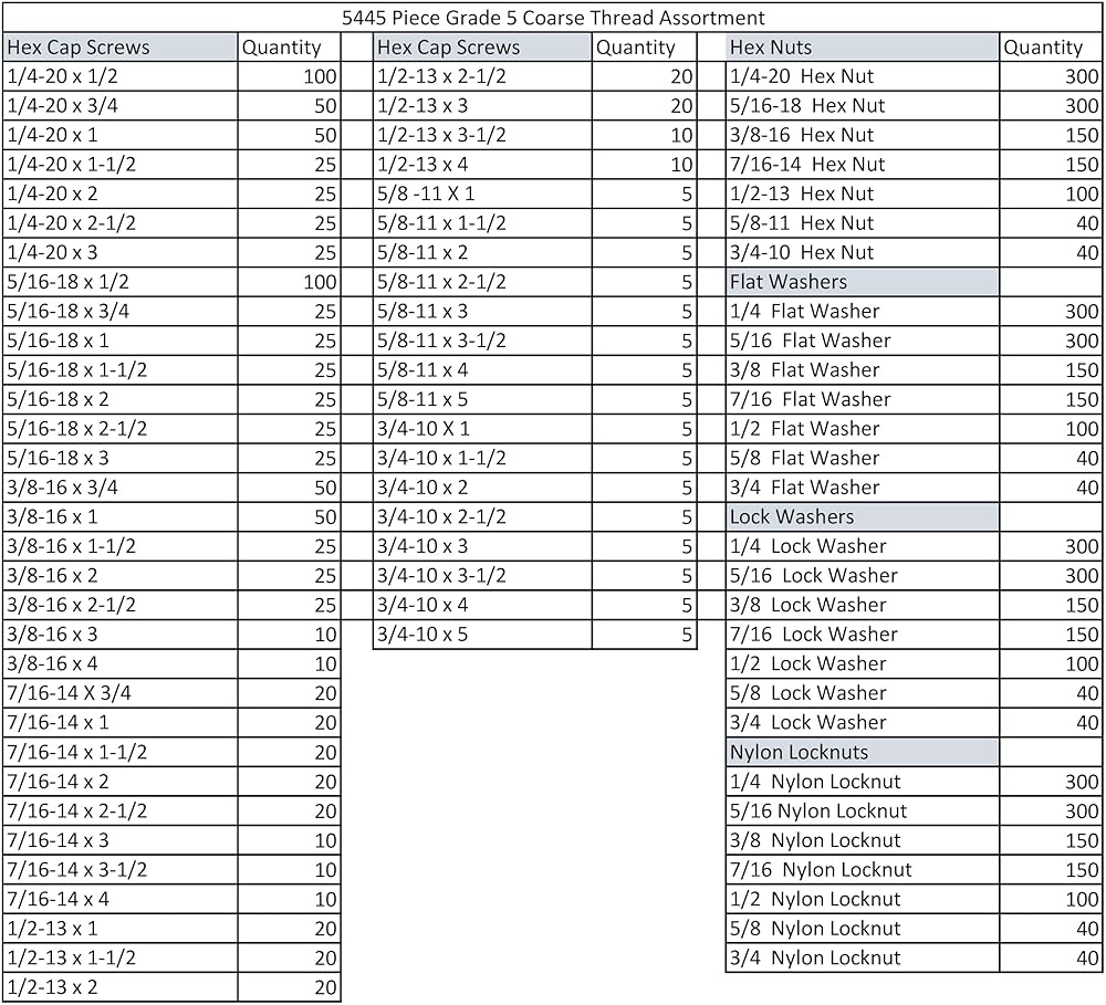 - Complete 5445-Piece Set – Includes a wide range of Grade 5 coarse thread fasteners for various applications.