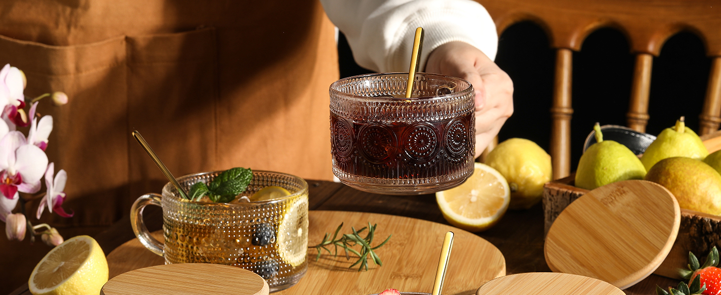 FULL OF VINTAGE AESTHETIC DESIGN: Classic mug-shape but in crystal glass has a delicate round curved handle. 2 sunflower patterned ones have fancy mandala-like borders decorated around like pendants. The rain-dots regularly arranged with different sizes that has a taste of a typical retro trend, making them all go well with every drinks matches with the metal spoons and bamboo lids even just with water giving your table out of plain styles and full of elegant old fashion ways.