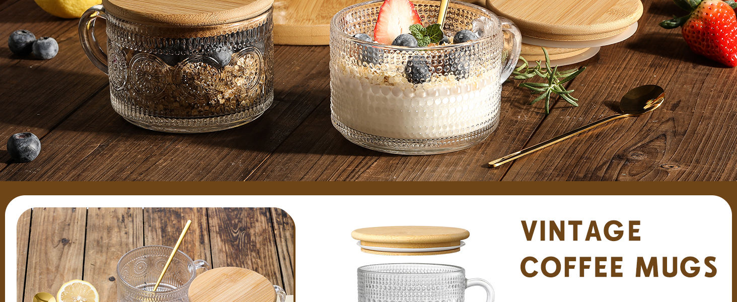 PRODUCT INCLUDES: 4 vintage coffee mugs that 2 embossed with sunflower patterns, and 2 with raindrops patterns, 4 rose-gold spoons, 4 100%-nature-bamboo sealed lids. Elegant and high-end outlook embellished with graceful designs, but meanwhile still being very practical of the combination.