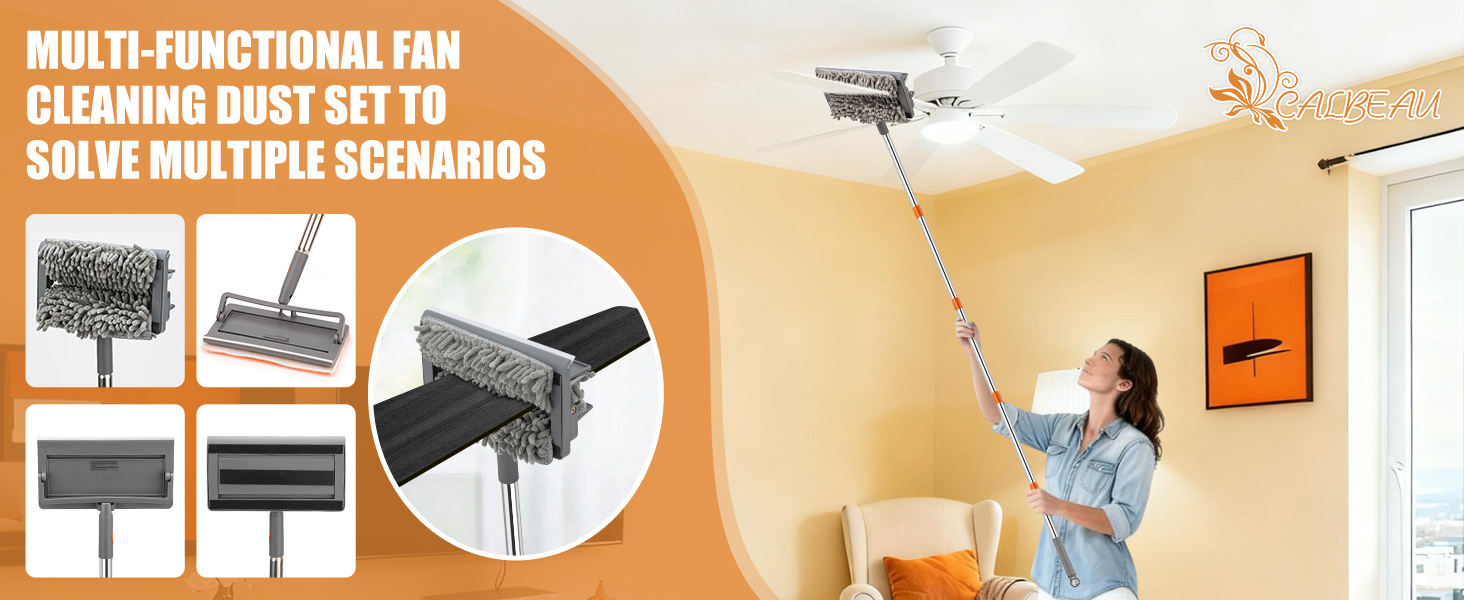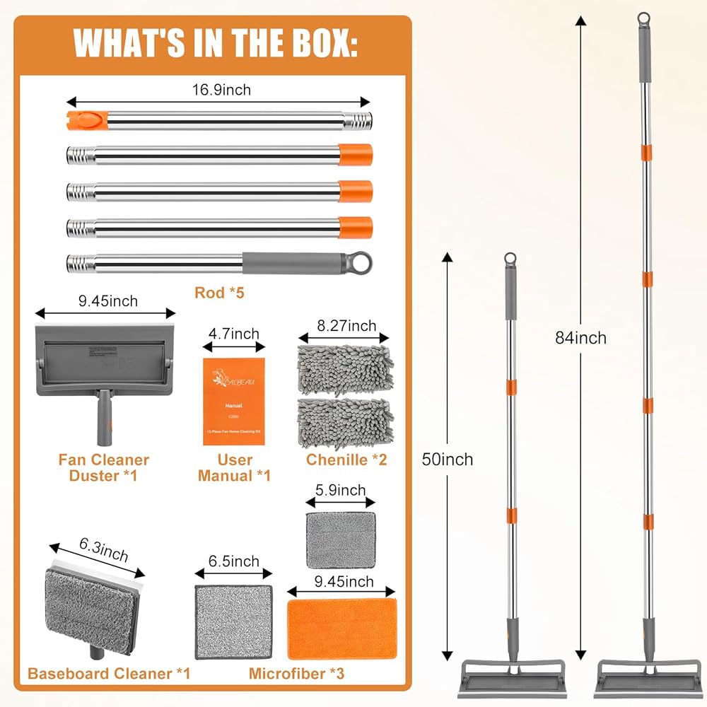 【Multi-functional Ceiling Fan Blade Duster Tool】The CALBEAU ceiling fan cleaner kit makes cleaning high and hard-to-reach areas easier than ever. This complete set includes 2 versatile cleaning heads, 2 plush chenille pads, 3 soft microfiber pads, 5 extendable rods (extending up to 84 inches), and a user manual