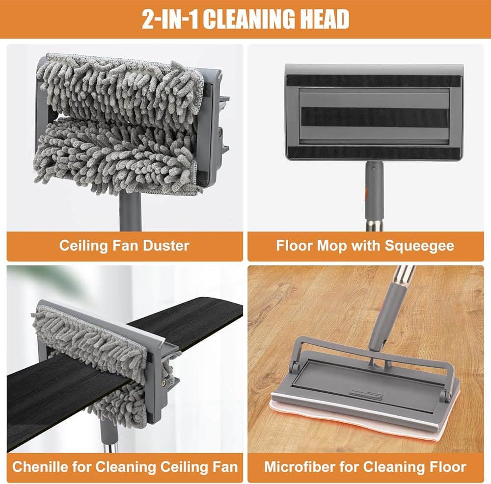 【84-inch Long Handle High Ceiling Fan Cleaner Duster】Clean ceiling fans safely and effectively without a ladder! The 8-inch wide chenille pad gently captures dust without scratching fan blades. Ceiling fan cleaning tools have long 84-inch handle, which helps you clean ceilings, windows, walls, and tall furniture—safely from the ground