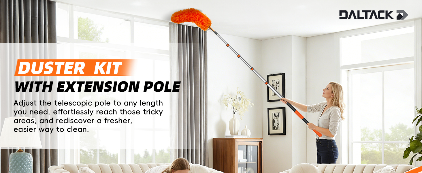 [Stable Handle Design] One of the key design highlights of DALTACK dust cleaner lies in its premium handle design. The pole of our extendable duster is freely adjustable between 5 and 20 feet, featuring a multi-section design that saves space for storage. Equipped with a quick-release buckle and non-slip grip, it allows one-click length adjustment and stays stable without slipping during use.