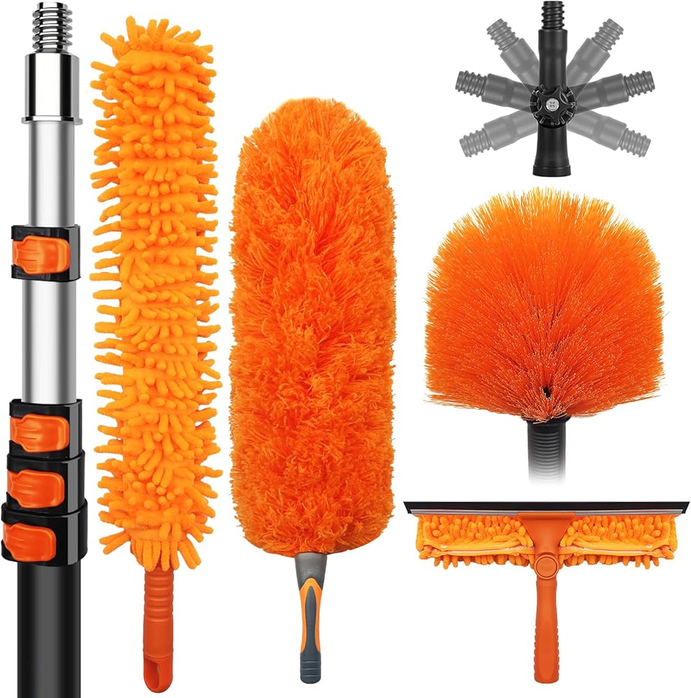 [All-in-One Duster Kit] DALTACK high reach duster kit features a duster with extension pole and multiple specialized brush heads—including a cobweb duster, feather duster, bendable ceiling fan cleaner duster, window squeegee, and a universal joint. As versatile dusters for cleaning, it covers every need from high ceilings to tight crevices, with no extra tools required.