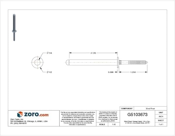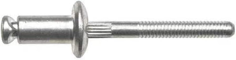 Blind Rivet,0.25 in dia,PK25, System of Measurement Inch, Body Length 1/2 in, Shank Diameter 0.25 in, Product Type Blind Rivet, Body Material Aluminum, Head Type Dome, Head Diameter 1/2 in, Maximum Hole Diameter 0.25 in, Minimum Material Thickness 1/32 in, Maximum Material Thickness 9/64 in, Material Grade/Class IFI-114-19, Mandrel Material Steel, Package Quantity 25