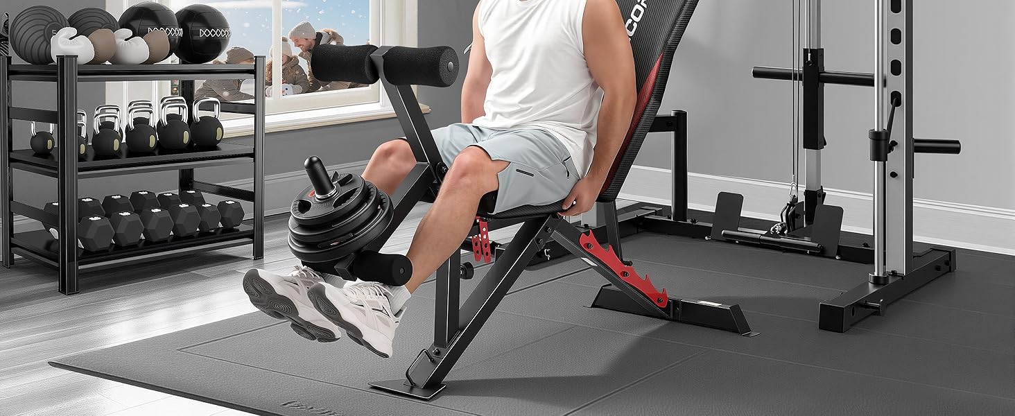 • 【Detachable Leg Developer with 2 in 1 Weight Rod 】This workout bench features a dual-function leg developer designed for focused lower body exercises, including leg extension and leg curls. Besides, it includes a dual-compatible weight rod that accommodates both Olympic and standard weight plates, providing flexible training options.(Screw in the bar to fit Olympic 2-inch weight plate/Remove the outer sleeve to fit standard 1-inch weight plate.)