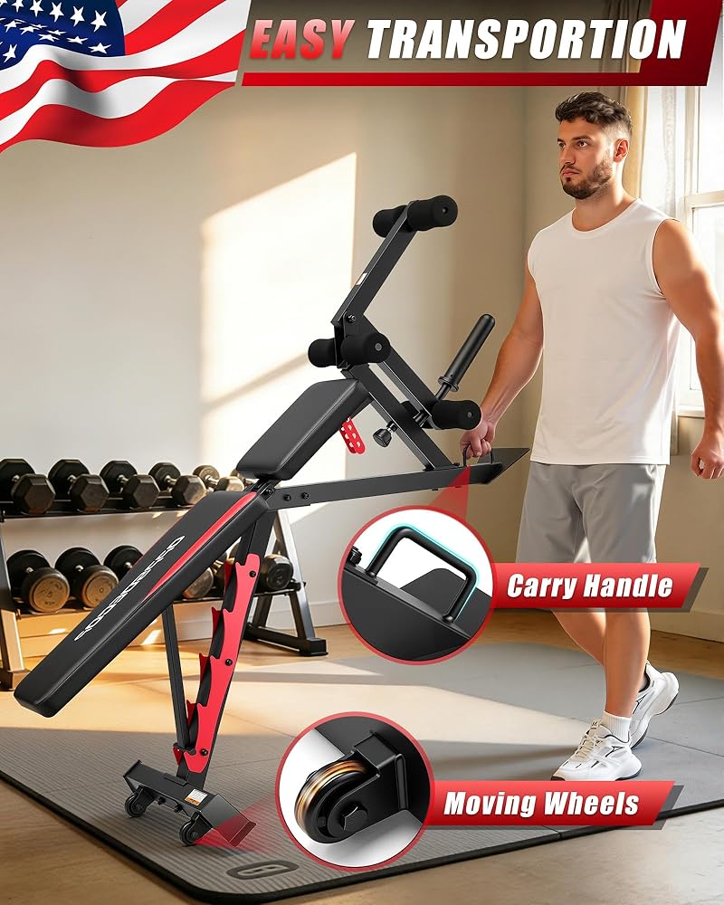 • 【Easy to Move】The rear section of this workout bench is equipped with transport wheels, making it convenient to move and store anywhere.
