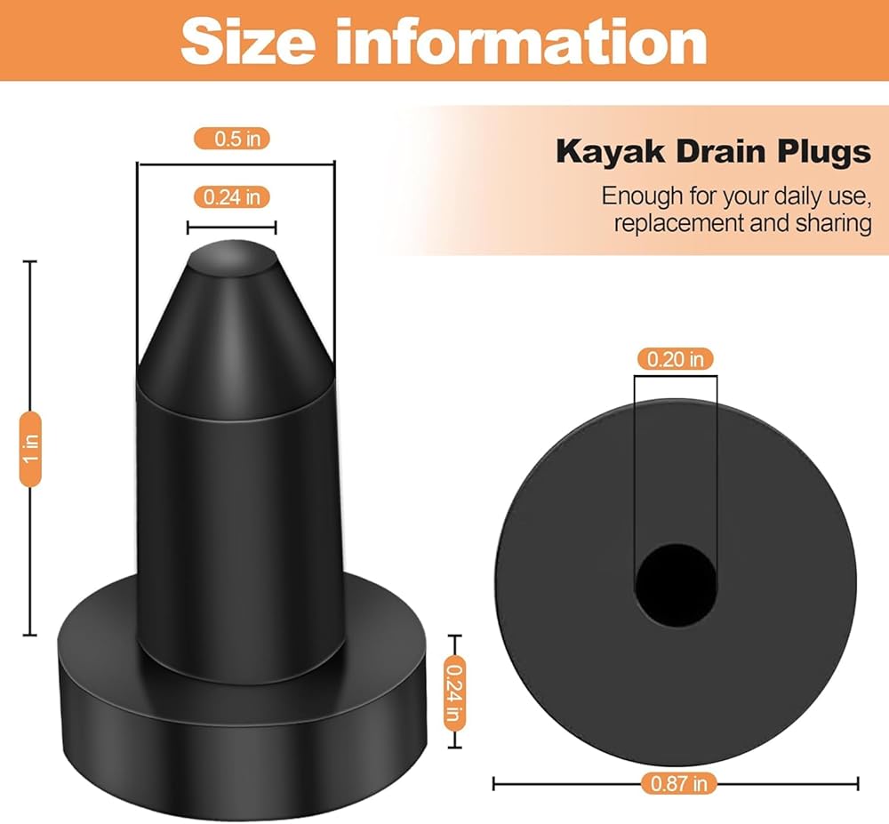 Size: the kayak drain plug fits for 1/2 inch opening; ~ Length: 1.25" ~ Diameter: 1/2", fit kayak scupper hole ranging from 1/2".