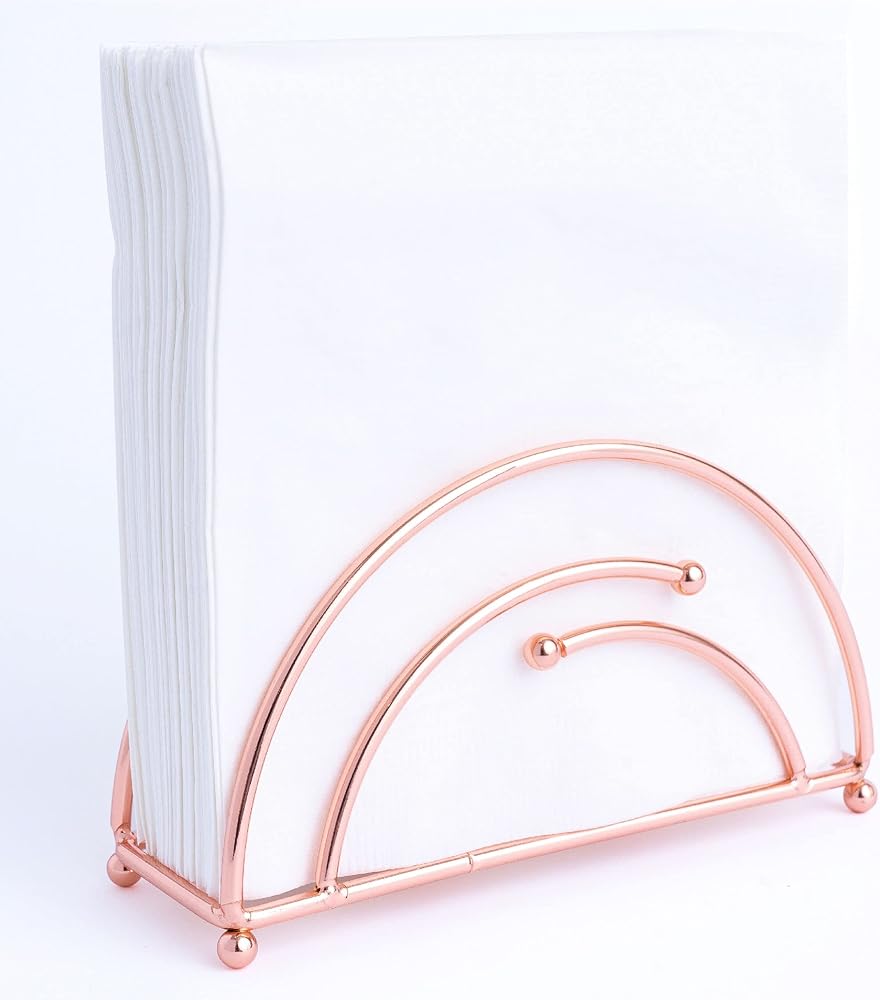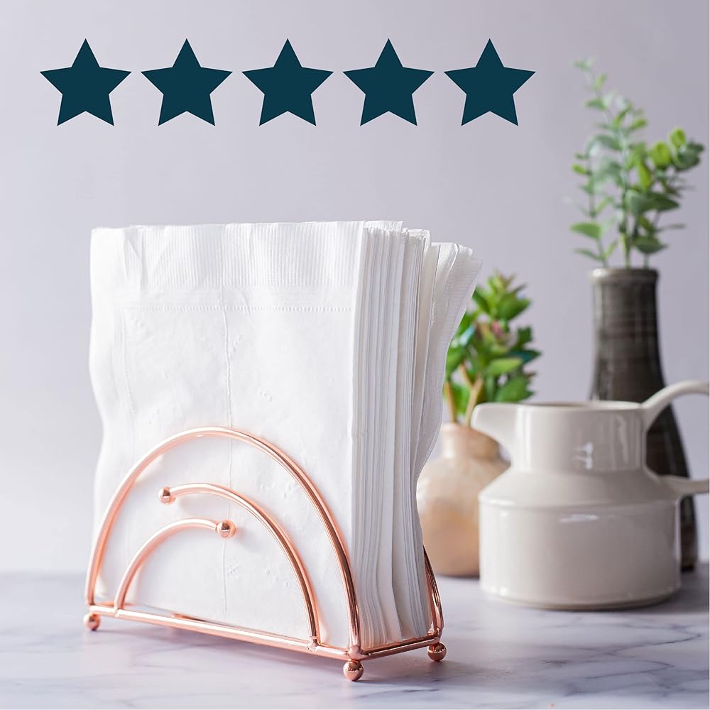 Beautiful Elegant Design: Add a touch of elegance to your table setting with our upright metal napkin holder. The rose gold color and half-circle design of our table napkin holder boast sleek lines and a modern aesthetic that complements any kitchen or dining room decor. Our tissue holder works great with any decor, takes up little space, and is attractive.