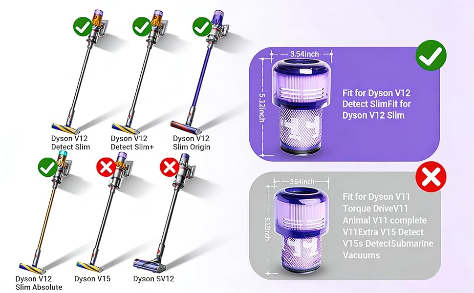 【FIT MODEL】Compatible with Dyson V12 Slim vacuums and V12 Detect Slim vacuums (part No. 971517-01). Please note that these filters are not suitable for SV12 and V15 Vacuum models.