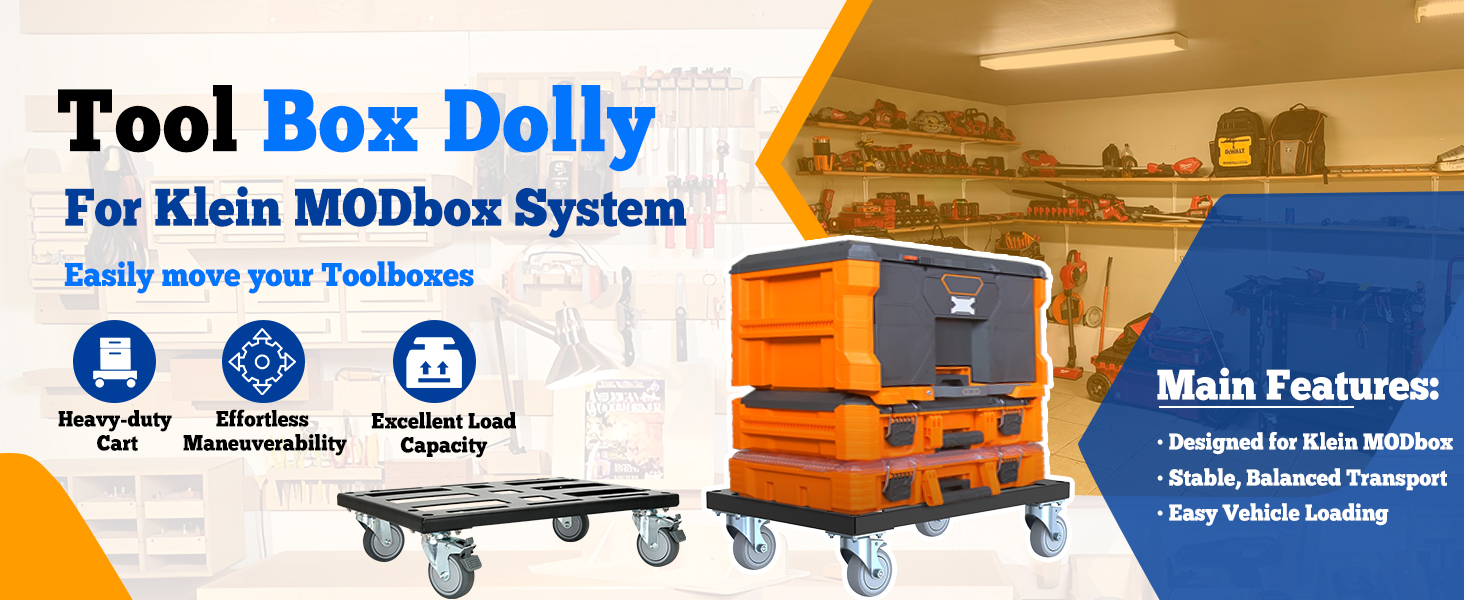 【360° Casters】Equipped with four universal 360° swivel casters, the dolly for Klein MODbox glides effortlessly in any direction, making maneuvering around tight spaces, garages, or job sites easy. Two locking casters provide stability when stationary, preventing unwanted rolling. No assembly is required—just place your toolboxes on the dolly and move with confidence. Durable wheels ensure smooth, reliable performance even under heavy loads.