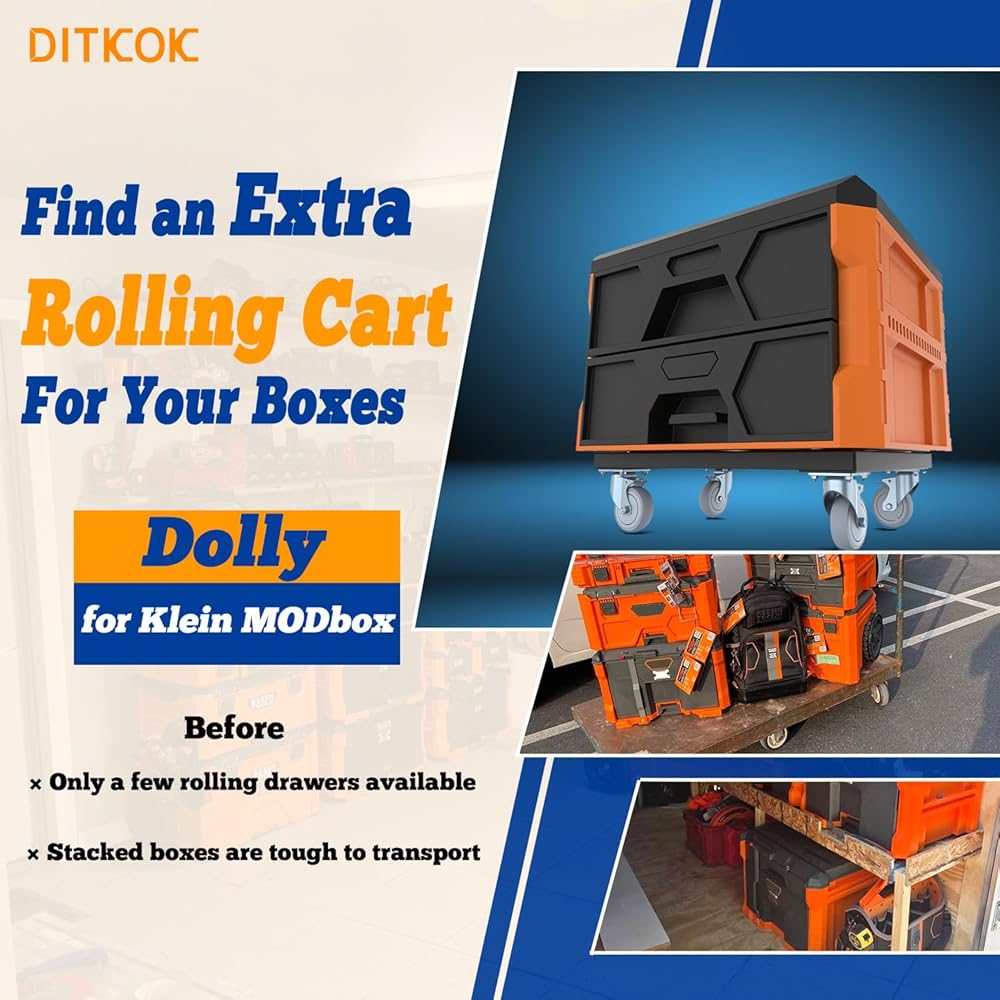 【Perfect Fit for Klein MODbox】Designed for full-width and half-width toolboxes, stackable storage units, and modular boxes. The DITKOK dolly's precision cutout securely fits the Klein MODbox system, preventing shifting or tipping during transport. Ideal for mechanics, electricians, and DIY enthusiasts, it keeps tools organized, accessible, and protected, boosting efficiency at home, in the workshop, or on the job site.