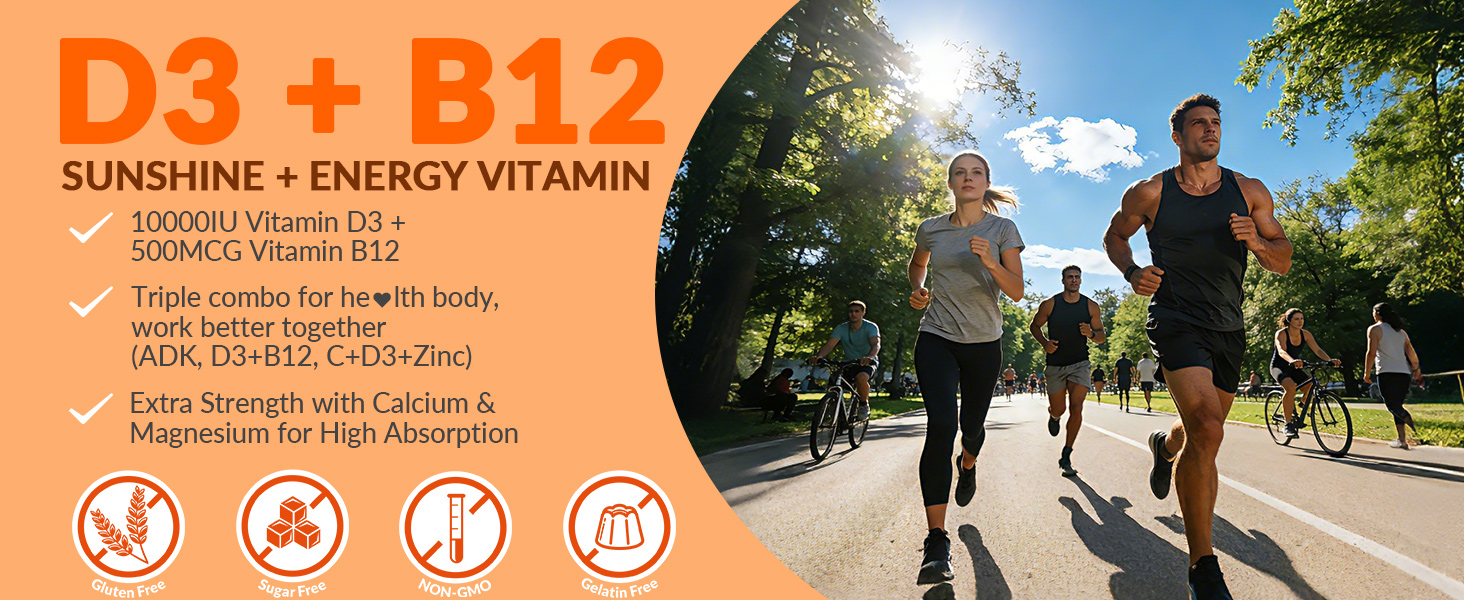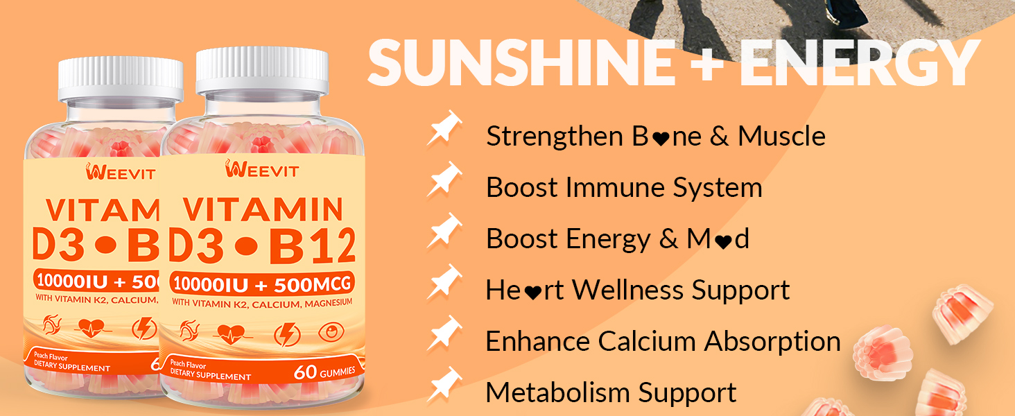 Vitamin D3 B12 Gummies - Our Vitmain d gummies provide 10000 IU of Vitamin D3 and 500 mcg of Vitamin B12 in highly absorbable forms. Also add Vitamin A, C, K2, Folate, Calcium, Magnesium and Zinc which may have different assistance effects on overall wellness.