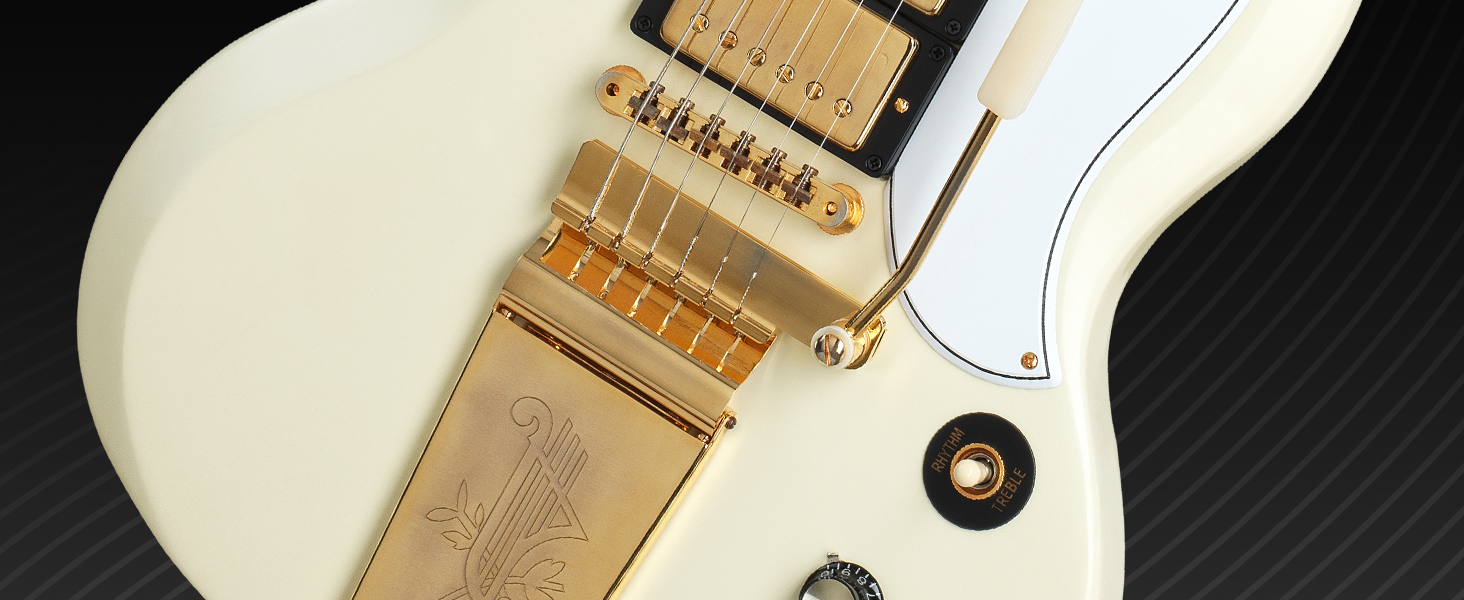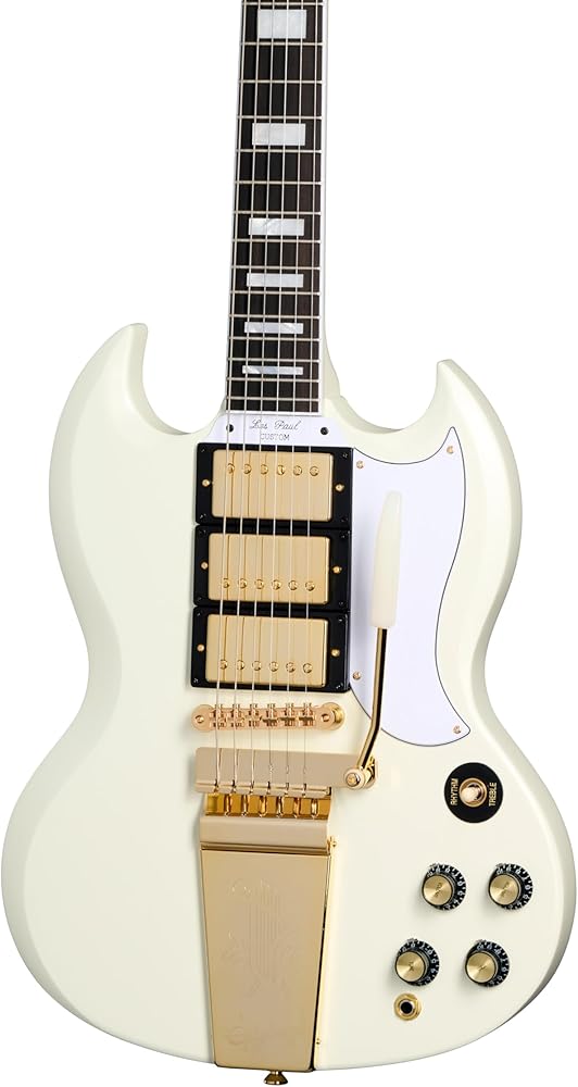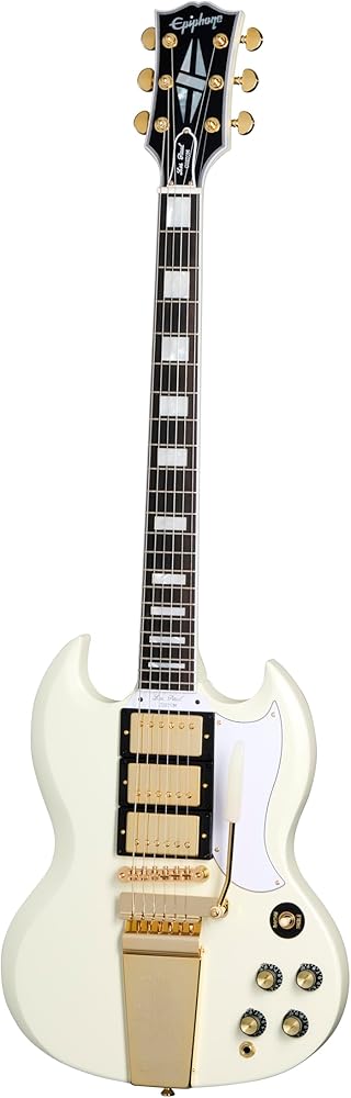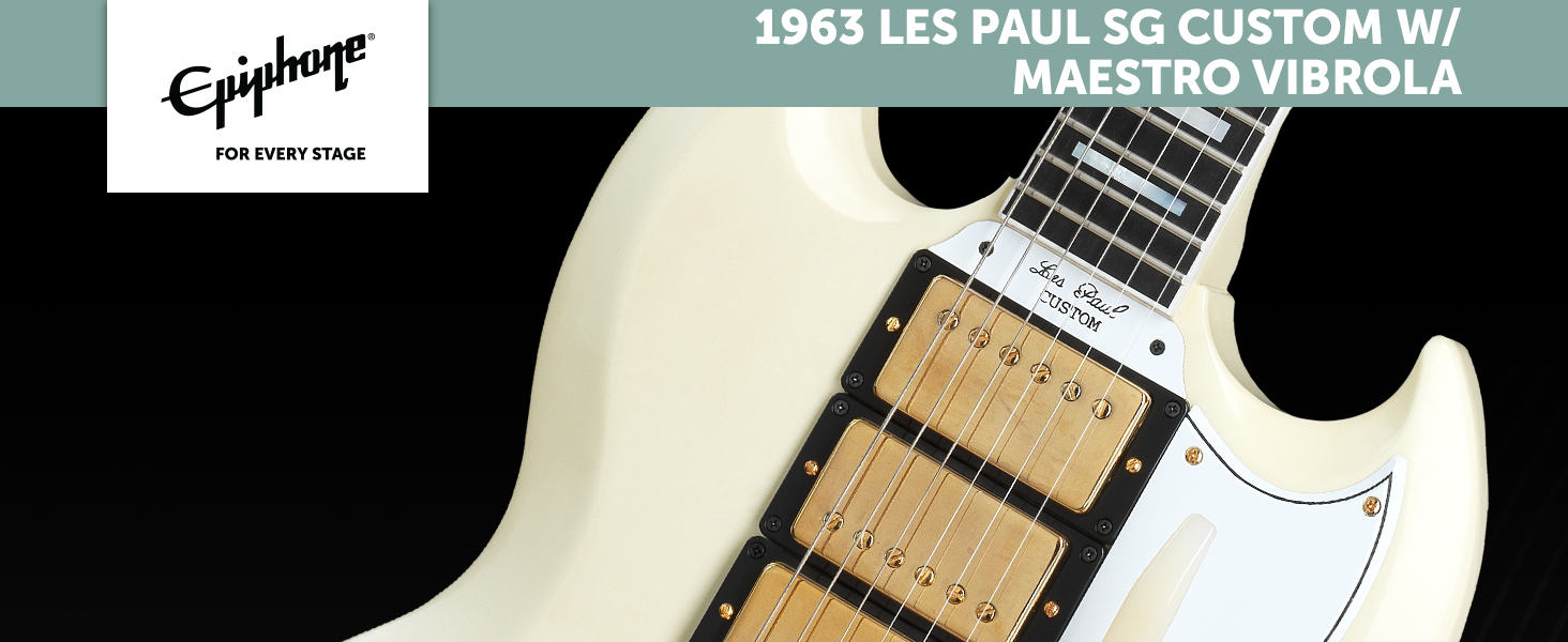 Made in collaboration with the Gibson Custom Shop, the Epiphone 1963 Les Paul SG With Maestro Vibrola is a stunning recreation of the classic vintage model. 1963 was the last year that the “Les Paul” moniker was used on the SG Custom and the first year for the Maestro Vibrola. The premium appointments the model is known and loved for are all present here, including a one-piece mahogany neck with a long neck tenon, a SlimTaper profile, and a bound ebony fretboard. It also features mother-of-pearl block fretboard inlays and a Custom split diamond headstock inlay on the bound Gibson-style “open book” headstock. The electronics are equally impressive, with three Gibson Custombucker humbucking pickups hand-wired to CTS potentiometers, Mallory capacitors, and a Switchcraft pickup selector toggle switch and output jack. The VOS (Vintage Original Sheen) Classic White finish is nicely complimented by the gold hardware, including 18:1 ratio Grover Rotomatic tuners. A black hardshell case with Inspired by Gibson Custom graphics and a goldenrod interior is also included.