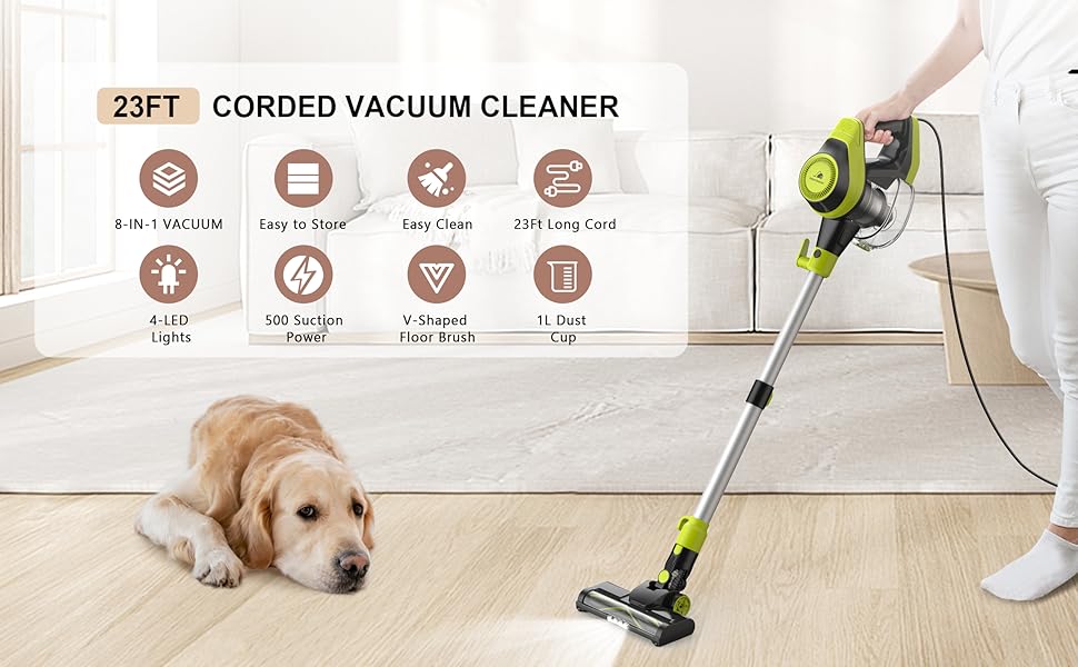 【23Ft Cord Length】:Consistent Power with 23Ft Cord Length Unlike cordless vacuums that lose power as the battery degrades, this vacuum offers consistent suction with its 23-foot power cord. No more worrying about battery life or recharging—clean freely without the hassle of switching outlets.