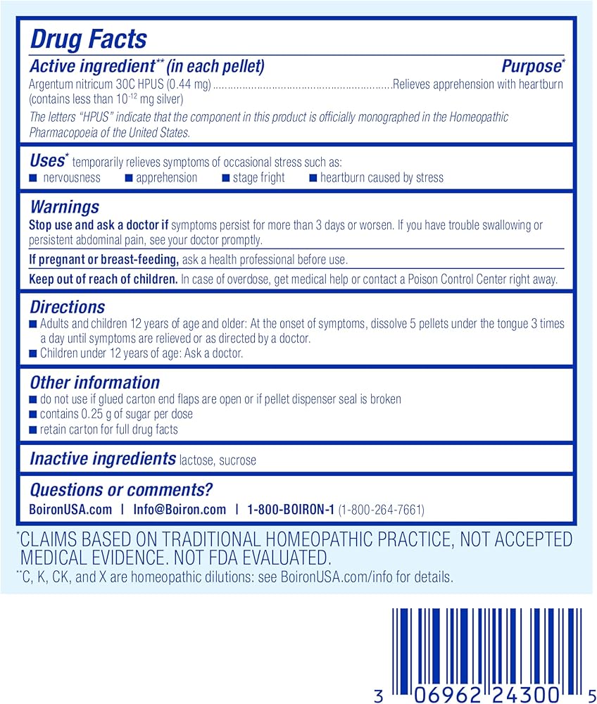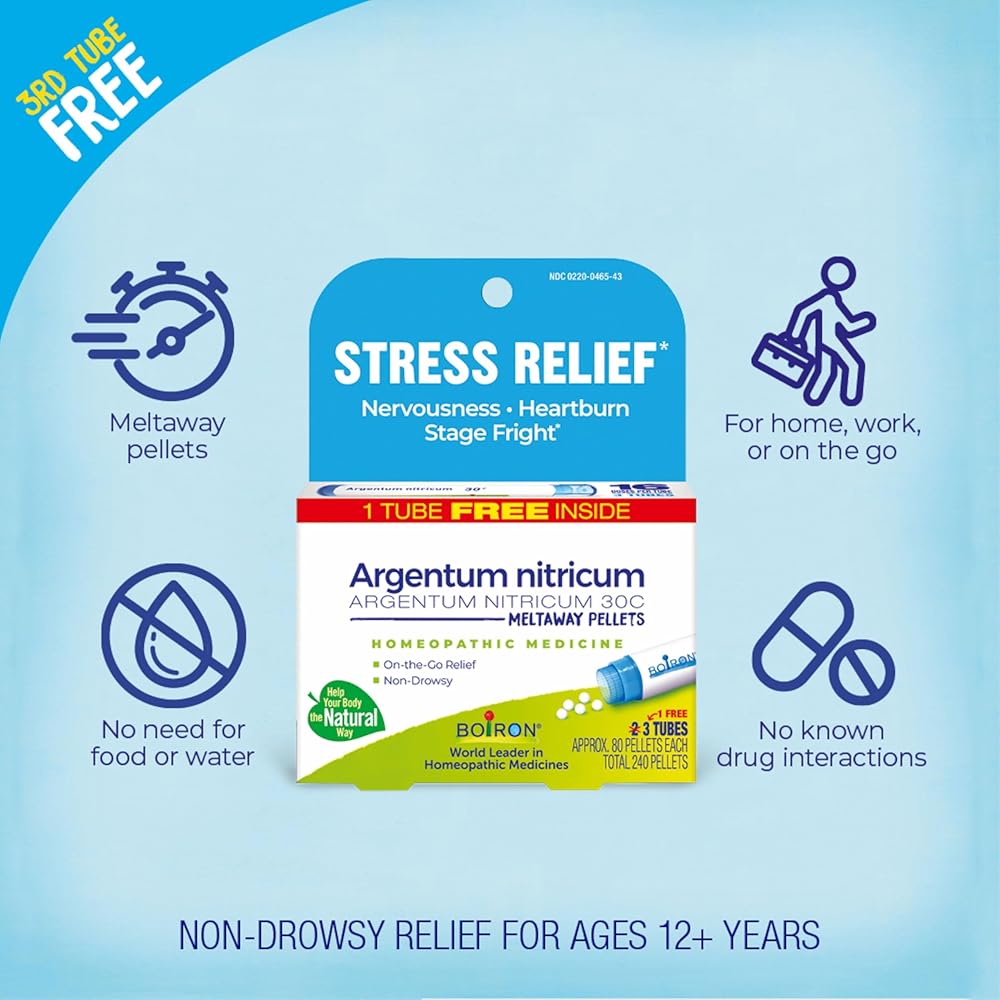 Customize your care with Boiron single medicines for highly targeted relief. Argentum nitricum 30C is a homeopathic medicine that targets symptoms of occasional stress such as nervousness, apprehension, stage fright, and heartburn caused by stress.* The non-drowsy meltaway pellets dissolve under the tongue without water and come in easy dispensing tubes to take on the go. *Claims based on traditional homeopathic practice, not accepted medical evidence. Not FDA evaluated.