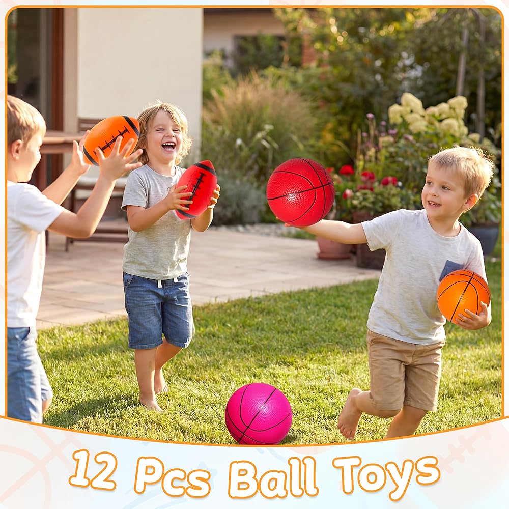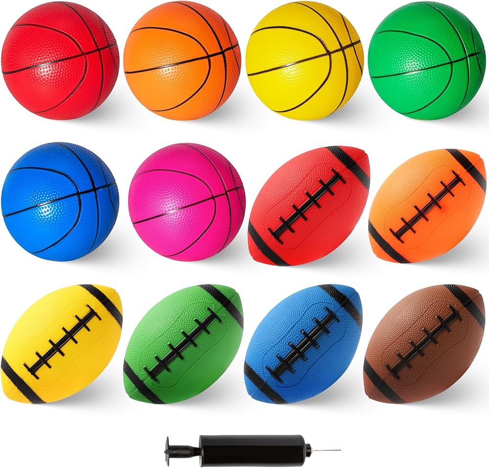 Value Complete Sports Ball Set: This 12 pcs inflatable ball toy set includes 6 mini basketballs and 6 mini footballs in vibrant assorted colors, plus 1 portable hand air pump (needle hidden inside pump handle). Ready to inflate and play instantly – ideal as mini footballs bulk, sports party supplies, or gift sets for active kids Bright Vibrant Color Design: Our kids football toys and mini basketball set features eye-catching bold hues that boost color recognition. Bright, attractive, and highly visible – great for football party favors, birthday parties, classroom rewards, and making every outdoor or pool game more fun and engaging Safe Soft Non-Toxic Material: Made of durable, nontoxic, odorless, and waterproof rubber – safe for all children. Soft, elastic, colorfast, and gentle on small hands. Reliable inflatable football and inflatable basketballs built for long-lasting play indoors and outdoors Easy-Grip Perfect Size for Kids: Textured non-slip surface improves grip, control, and handling – ideal for small hands. 7-inch compact small football for kids and small basketball size, lightweight, airtight, and leak-resistant. Perfect as football toys for boys 8-12, football toys for kids 5-7 Wide Application: Versatile kids basketball and football for kids 5-7 set works great for backyard games, playground, beach, pool basketballs. Enhances hand-eye coordination, motor skills, and active play naturally
