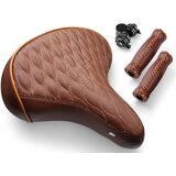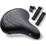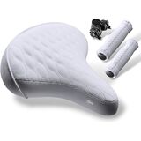 Upgrade your ride with the CYCLEZ Beach Cruiser Saddle & Leather-Style Grip Set, designed for riders who want comfort, durability, and style in one complete package. This premium saddle features heavy-duty double spring shock absorption, providing a smoother, more stable ride on beach cruisers, city bikes, e-bikes, MTB, and more. The wide erfonomic shape supports the hips comfortably, while the soft cushioned interior reduces pressure during long rides. Crafted with elegant vynil leather and finished with detailed stitching, the saddle brings a clean, classic look that fits both modern and vintage bicycle styles. Matching vinyl leather grips with stitched seams and protective end caps to complete the set, offering a secure, comfortable hand feel with added durability. Built for everyday riders and weekend cruisers alike, this set is a true comfort upgrade you can feel from the first ride.