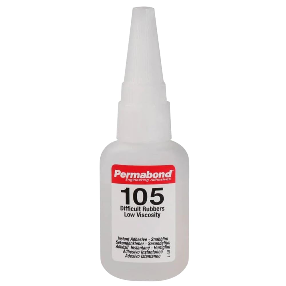 Permabond 105 is a low viscosity cyanoacrylate adhesive engineered for bonding traditionally difficult materials like natural and synthetic rubbers (including EPDM and Butyl rubber) and hard-to-bond plastics. This single-component adhesive requires no mixing or heat curing, making it ideal for high-speed production lines. With a viscosity of 30-50 cP at 77°F, it provides excellent capillary action for tight-fitting parts. The adhesive cures rapidly through surface moisture, achieving handling strength in 5-15 seconds and full strength within 24 hours. It offers impressive shear strength up to 3200 psi on steel and maintains performance from -67°F to 212°F. The colorless formula creates virtually invisible bond lines and fills gaps up to 0.004 inches. For optimal results, surfaces should be clean, dry, and free from grease. While the adhesive works well on most materials, some surfaces may require special preparation or primers for best results.