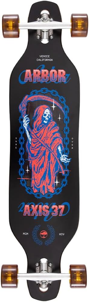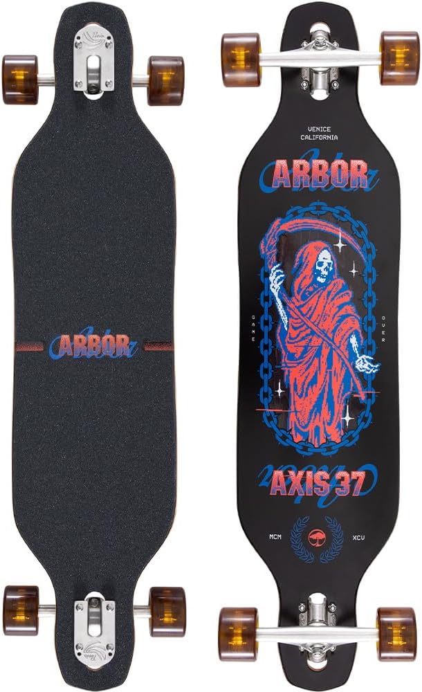 The Arbor Journey Reaper Axis Skateboard Complete is designed for easy around-town cruising, relaxed commutes, and mellow downhill rides. Featuring a snowboard-inspired drop-through shape (37” L x 8.875” W) with a 27” wheelbase, this board offers a stable and smooth ride. The 7-ply sustainable Canadian maple deck is FSC-certified, combining durability with eco-conscious design. Paired with Paris Reverse 50° trucks, Arbor Easyrider Outlook wheels, and ABEC 7 bearings, this board is built for responsive carving and smooth, fast rolling. The 1/8” risers and die-cut griptape ensure a comfortable, controlled ride for skaters of all levels.L: 37.00" W: 8.875" WB: 27.00"Deck7 Ply Sustainable Canadian MapleWood material comes from sustainable sources of supply - FSC CertifiedTrucksParis Reverse 50° 180mm TrucksWheelsArbor Easyrider Series - OutlookDesigned for carving and cruisingLarger shape increases rolling speedSize: 69mm // Durometer: 78A Contact Patch: 44.0mm // Offset: 0.0mmVenice Formula: Soft and grippyOther ComponentsABEC 7 Bearings w/ Spacers1/8" Paris RisersDie-Cut Griptape