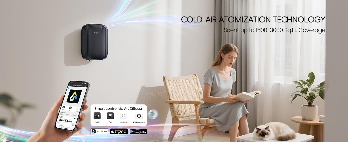 POWERFUL SCENT & WIDE COVERAGE - No heating or adding water to add fragrance to your environment within minutes, bringing high-quality aroma to the entire room of 1500-3000 Sq.Ft.evenly.This aroma diffuser adapts two-fluid atomization technology by High-pressure air to fully atomize the essential oil into tiny nano-particle mist for efficient diffusion
