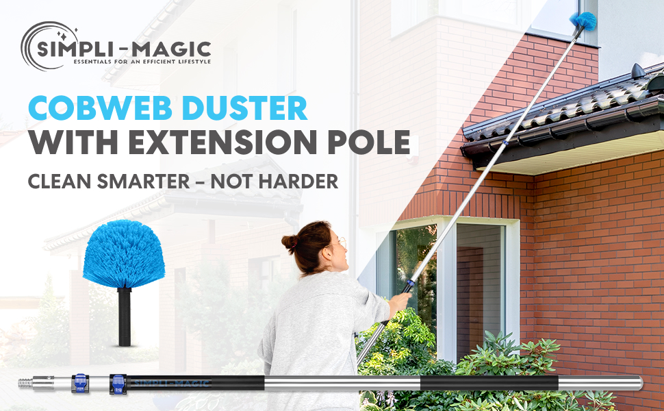 Simpli-Magic 5-to-12 Foot Cobweb Duster with Extension Pole Combo (20 Ft Reach, Medium-Stiff Bristles), Spider Web Brush with Pole - Hand-Packaged, Lightweight, 3-Stage Aluminum Pole