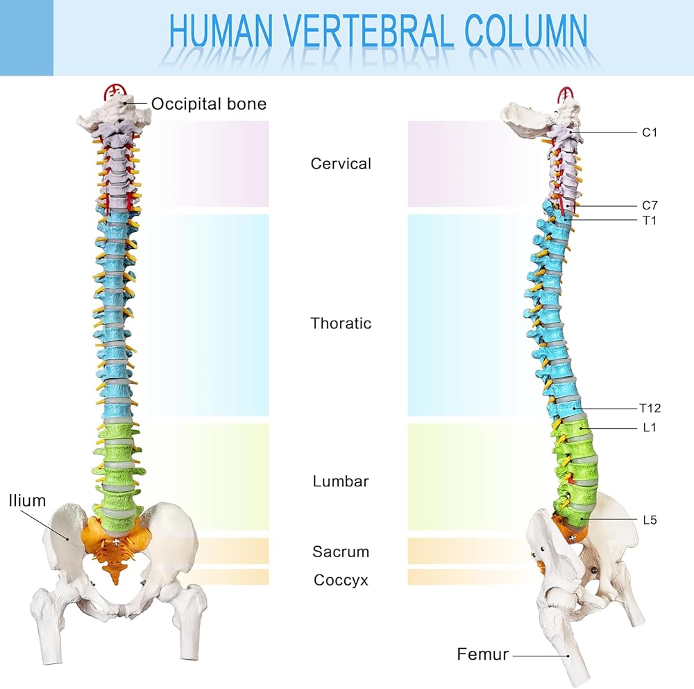 👫 Colorful Spinal Model : Life sized model of the human spine.Different bone structures are painted in different colors for easy explanation and distinction. Including the occipital bone, 24 vertebrae, sacrum, coccyx, left and right hip bones, pubic bone, and left and right femoral heads. In addition to this left and right hip bones, femurs and pubic bones can be dissemble.