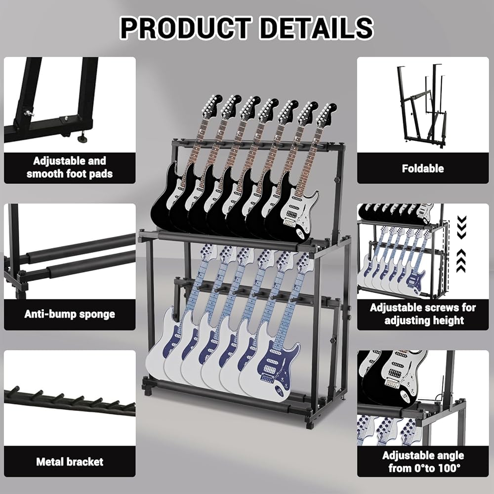Adjustable Dual-Tier 14-Guitar Stand – Versatile Storage & Display SolutionMaximize Your Space: Effortlessly organize and showcase up to 14 guitars with this high-capacity dual-layer guitar rack. Perfect for home studios, stages, bands, or music classrooms, the detachable design allows you to split the stand into two independent 7-guitar racks to suit any environment.