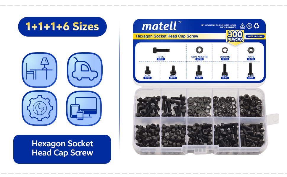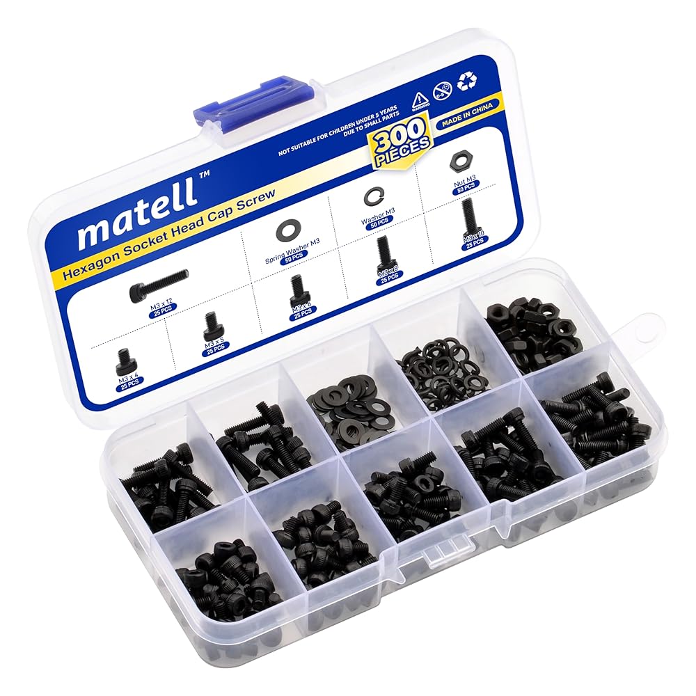 Package Included:300Pcs black hex socket head cap screws nuts and washers ,the size are: M3x4mm,M3x5mm,M3x6mm,M3x8mm,M3x10mm, each style screws are 25pcs,50Pcs M3 nuts,50Pcs M3 spring washers,50pcs M3 washers.
