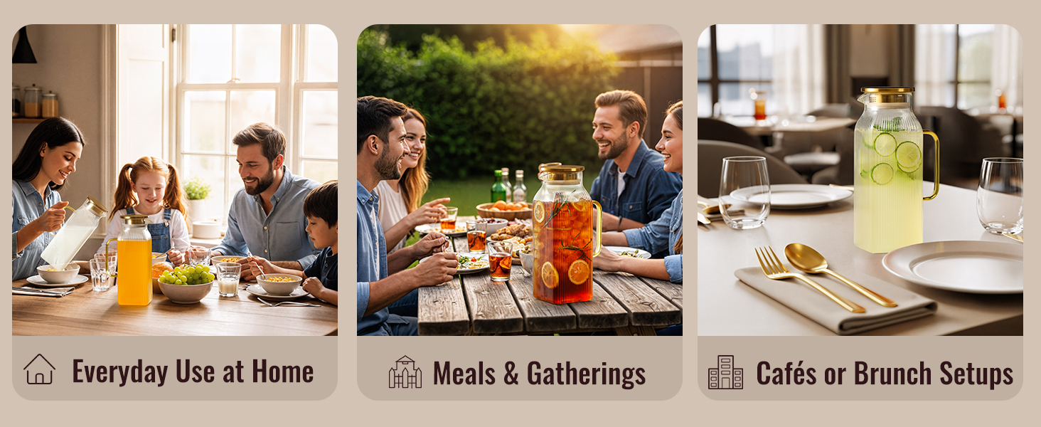 Multiple Scenarios: Our elegantly crafted glass pitcher that add a touch of sophistication to any table setting. This premium 68oz (Half Gallon) dispenser is specially designed for serving artisanal beverages to 6-8 guests, making it perfect for iced coffee, hot or iced tea, refreshing fruit juices, milk, soda. The thoughtful design and generous capacity have made it a favorite choice for both home use in kitchens and professional settings including breweries, cafes, bars, and restaurants
