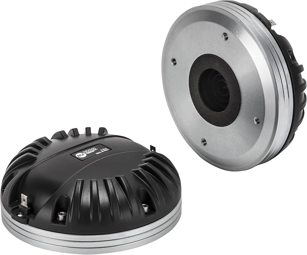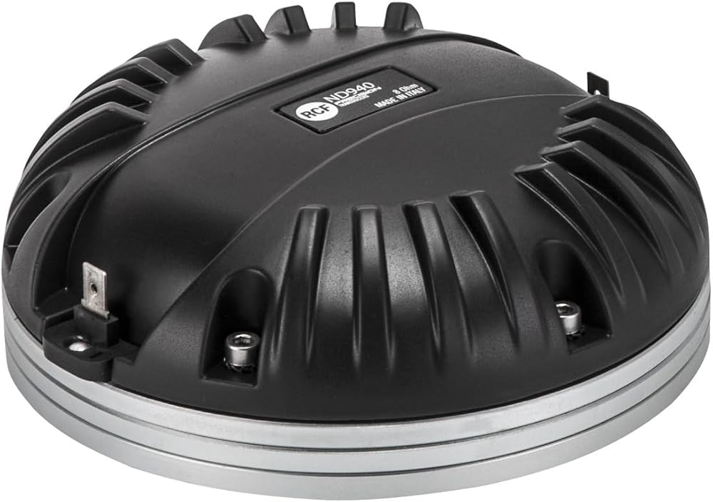 The ND940 is a ultra compact size, high performance, high power handling 4.0-inch diaphragm compression driver with a 1.4 inch exit throat. A thin copper ring is precision pressed on to the pole piece in order to modify and lower the inductance characteristics of the magnetic circuit and voice coil providing a controlled extension of the acoustic frequency response. The voice coil assembly is designed using a high strength, high temperature Kapton voice coil former and edge wound copper clad aluminium wire directly joined to the diaphragm by RCF proprietary Direct Drive kapton technology. The ND940 features a 4-slot, optimised geometry, phase plug design. Extended computer assisted mathematical modelling and testing has resulted in a geometry that provides a balanced acoustic performance controlling and lowering air distortion and maximizing output. || Features || 4.0 inch, Kapton former, edge wound aluminium voice coil || 280W continuous program power handling || Frequency range: 500Hz - 20kHz || 4-slot optimized geometry phase plug || Titanium diaphragm, Polyimide surround || Safety agency : CE compliant || Thiele - small parameters || Bl factor (Bl) (T x m) : 17.60 T x m || SPECIFICATIONS || Exit Throat Diameter : 1.4 inch / 36 mm || Related Impedance : 8 ohm || Program Power (watt) : 280 W || Power handling capacity : 140 W || Sensitivity : 110 dB || Frequency range : 500 - 20000 Hz || Diaphragm Material : Pure Titanium || Suspension Material : Polyimide || Suspension Design : Flat || Minimum Impedance (ohm) : 8.50 ohm || Voice Coil Diameter : 4.0 inch / 102 mm || Voice Coil Winding Material : Edgewound Aluminum || Voice Coil Former Design : Direct Drive Kapton || Number of layers : 1 || Kind of layers : outside || Flux Density : 2.0 T || Phase Plug Design : 4 slot || Phase Plug Material : Aluminum || Magnetics : Neodymium || Voice Coil Demodulation Ring : Copper || MOUNTING INFORMATION || Overall diameter : 140 mm / 5.51 inches || Overall height : 60 mm / 2.36 inches || Mounting : 4 x 6 mm threaded holes at 90° || Weight : 2.72 kg / 6 lbs || SHIPPING INFORMATION || Package Height : 79 mm / 3.11 inches || Package Width : 169 mm / 6.65 inches || Package Depth : 171 mm / 6.73 inches || Package Weight : 2.87 kg / 6.33 lbs ||