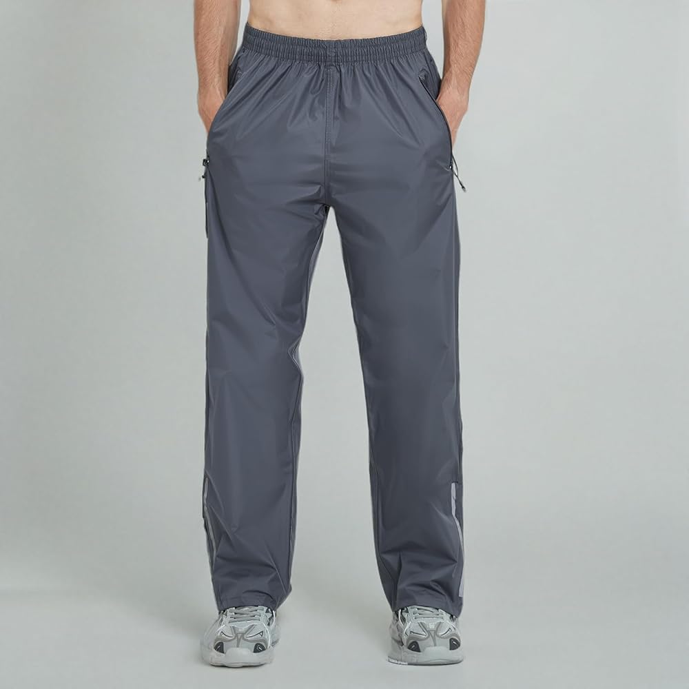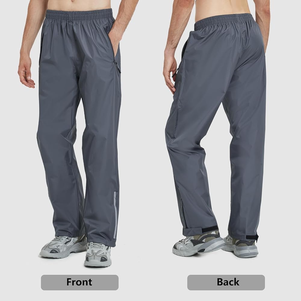 COMFORTABLE DESIGN: Rain pants men waterproof with 2 zippered side pockets for easy storage of small essentials. Elastic waistband and built-in waist drawstring rain pants can easily adjust the waist to suit different waist sizes
